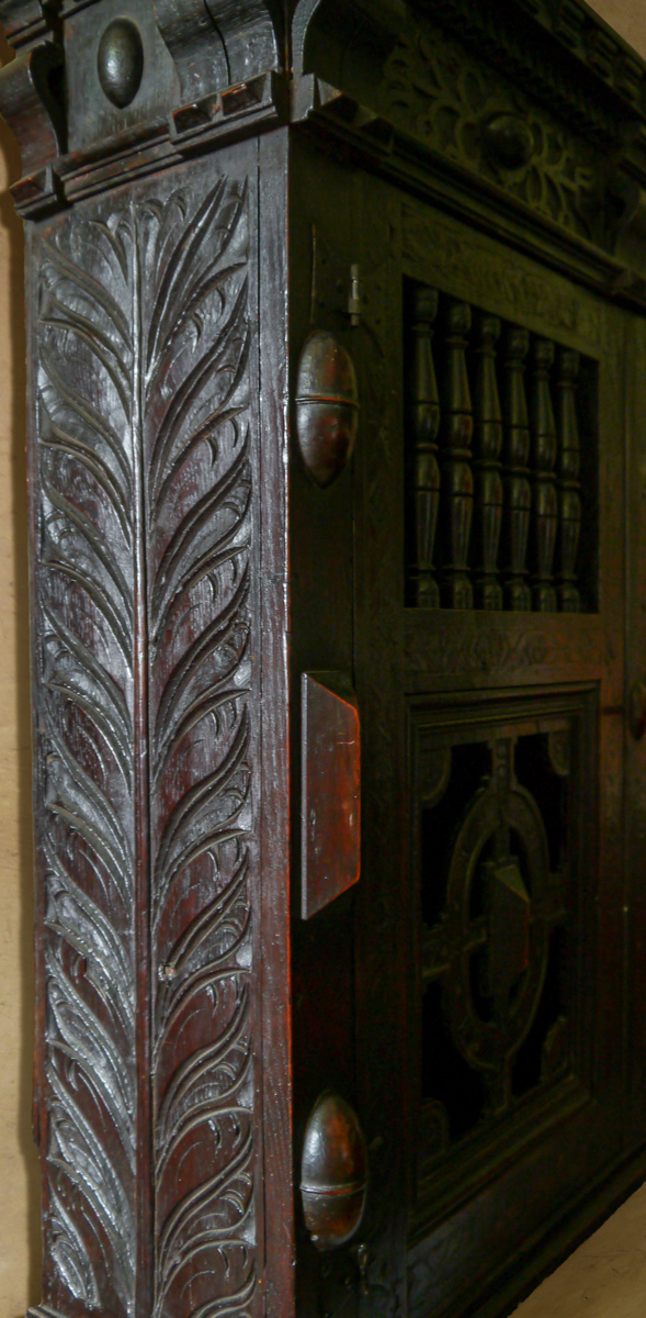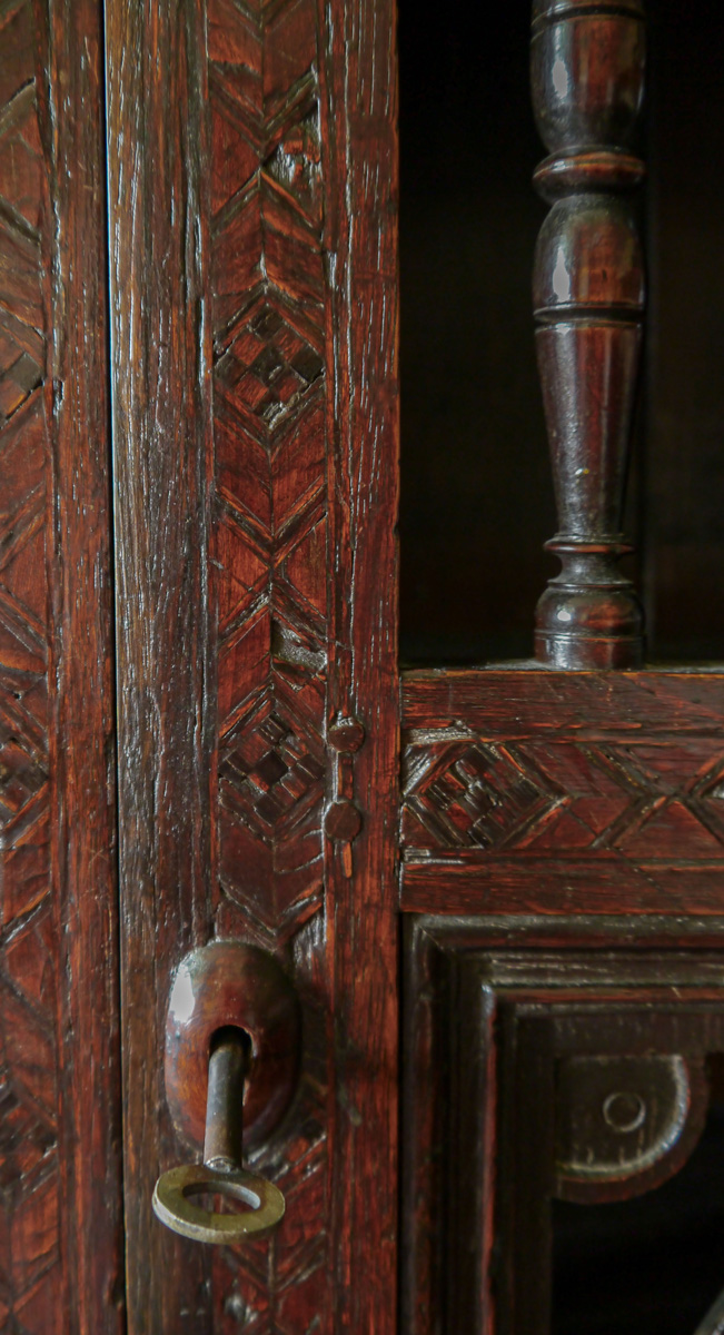 The two doors hang on the original iron butterfly hinges, each having an upper panel of elegantly turned fruitwood spindles, and a lower panel of open symmetrical fretwork. The frame of the doors is embellished with extremely fine parquetry bands, set out in a joined lozenge pattern.