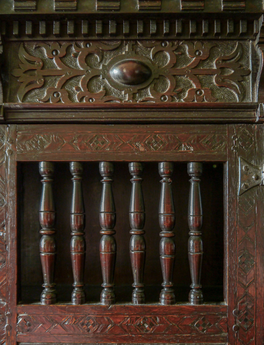 The front is decorated with further split egg turnings, and in addition split faceted-cut elongated lozenges. Most unusually panel, or board, is carved with extremely bold floral leaves joined to a vertical fleshy stem.