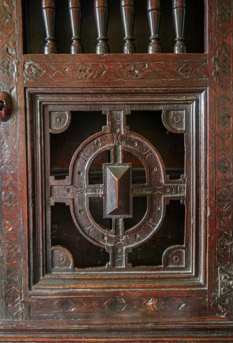 Having a boarded top, above a dentil moulding with bolection supports to the centre and outer corners. This decoration extends round each side, as does the panelled strapwork carved with stylised flowerheads around a central split “egg-shaped” turning.
