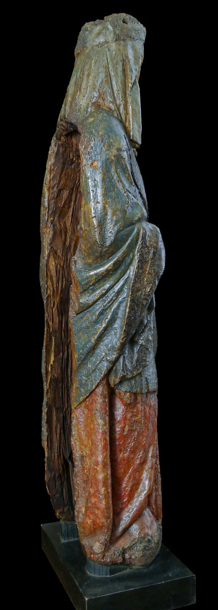 Mary, with a relaxed stance, one knee pushed slightly forward, and a gentle facial expression, holding Christ in her crooked left arm.