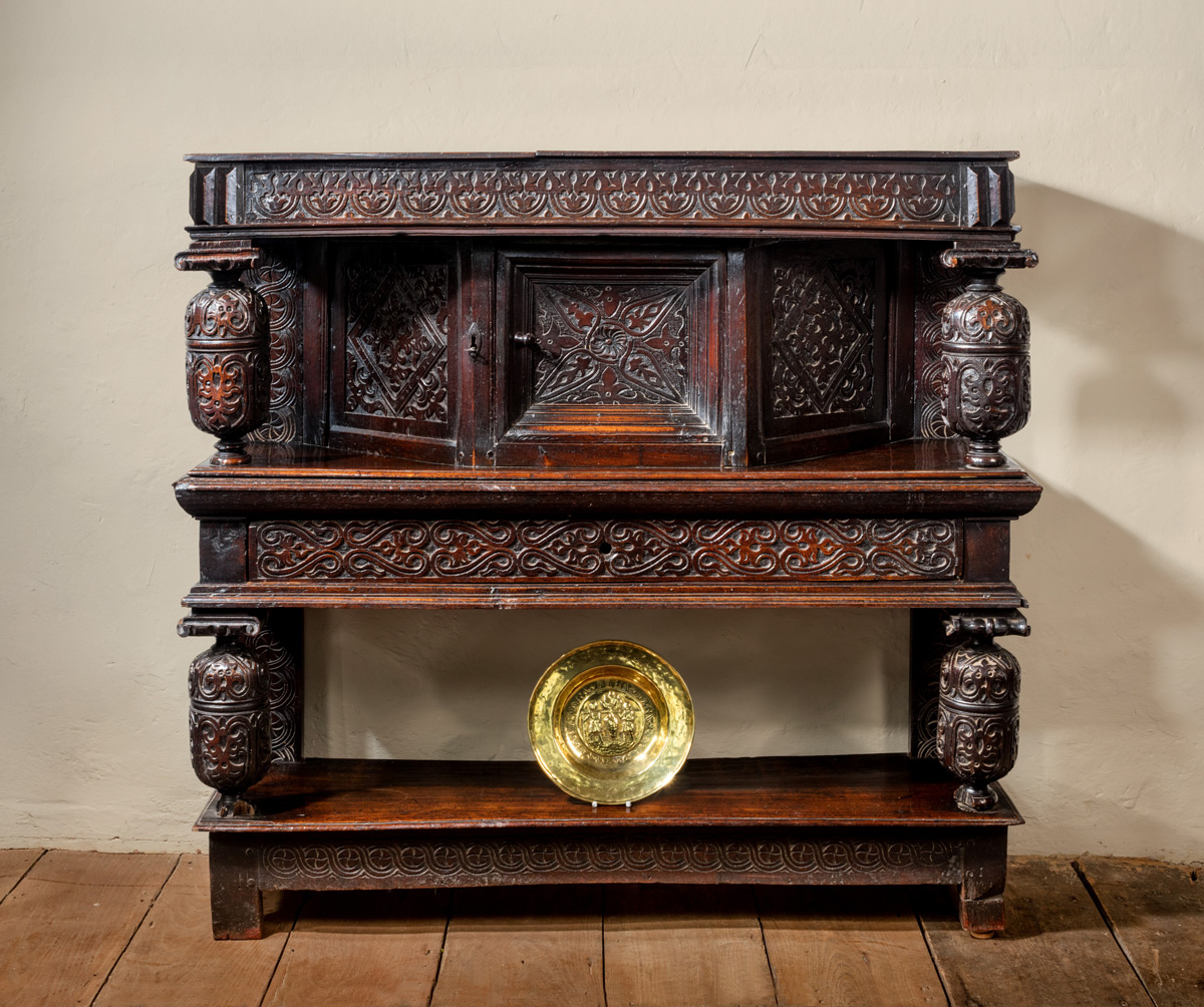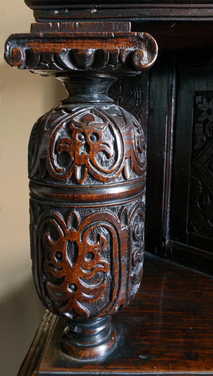 A fine James I oak standing cupboard. The single piece top, with strapwork carved frieze, with triangular boss embellishments. The enclosed cupboard with panelled door, with canted sides, all carved with typical Gloucestershire motifs. The frieze drawer above an open under-tier, which again has a single piece potboard. The bulbous turned front supports ornately carved with floral motifs.