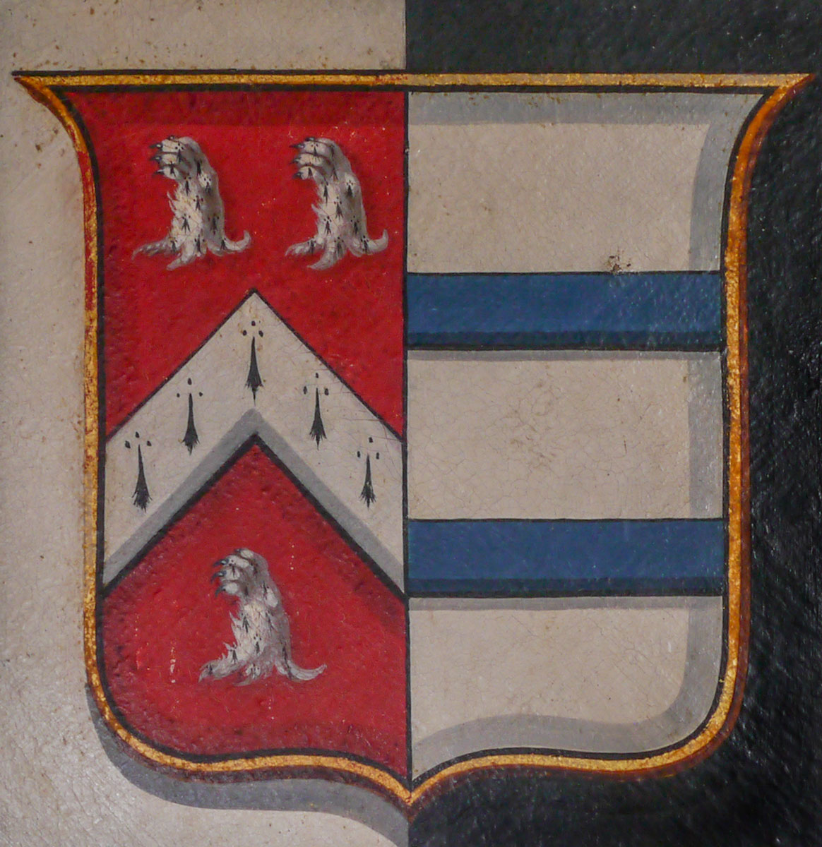 The heraldic symbols and colours of gold, silver and red are associated with the name 'Denham'.