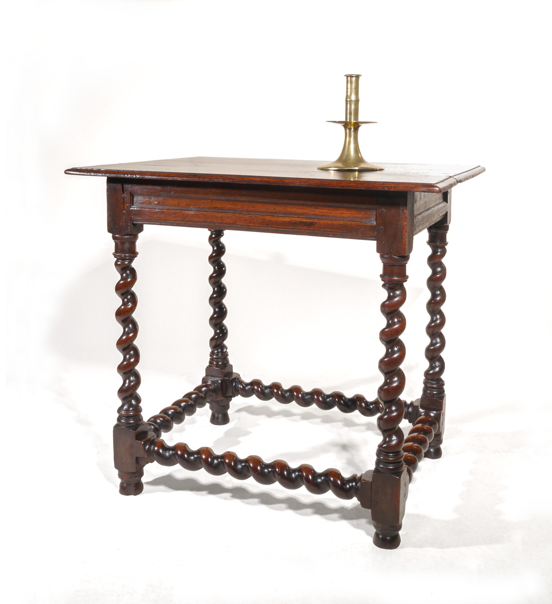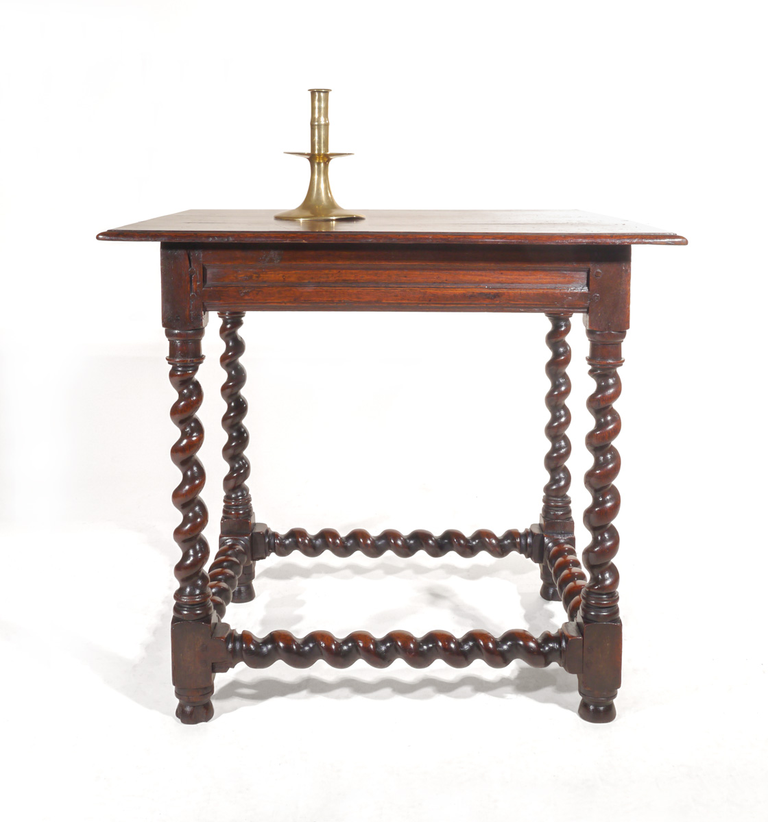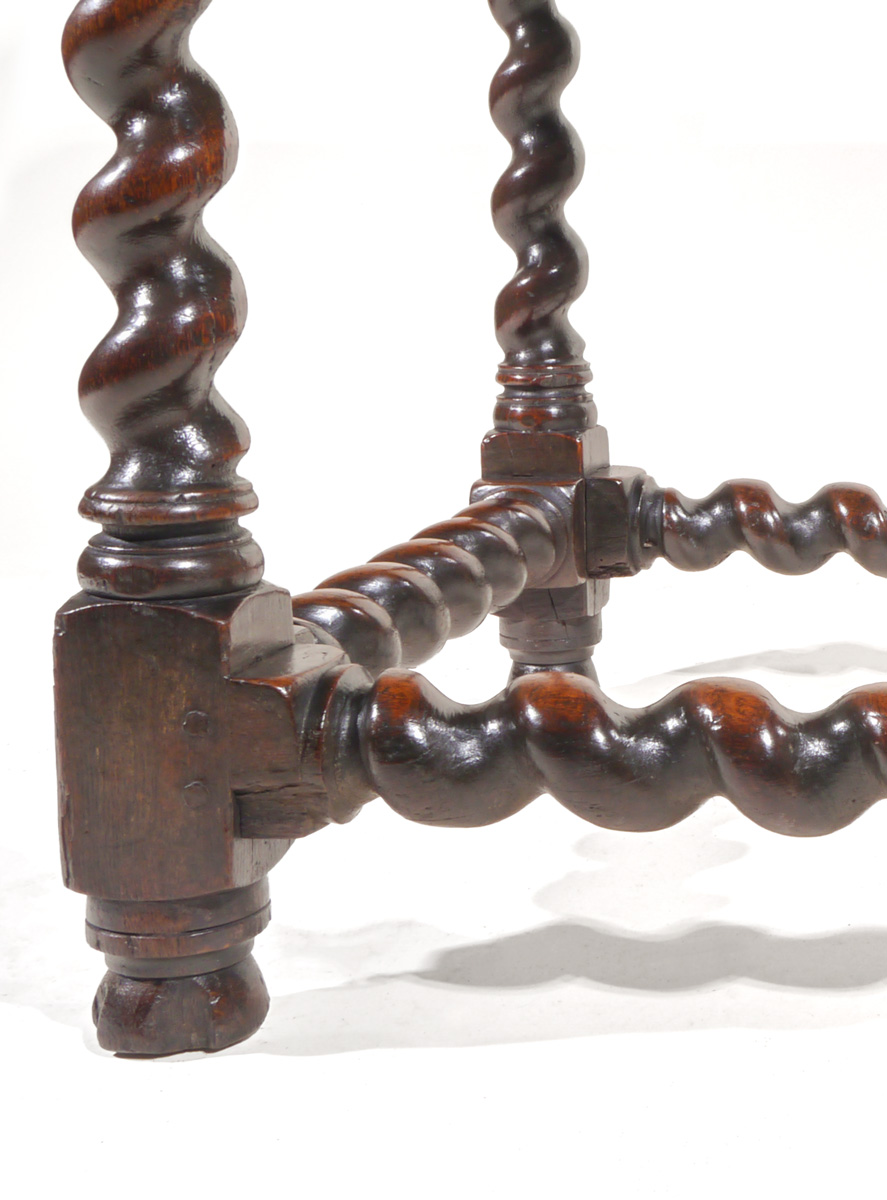 The three plank top, above a deep channel moulded frame, supported on exceptionally well and heavily turned barley twist legs (which taper very slightly from bottom to top), terminating in the original turned toes. The legs are joined by barley twist stretchers.