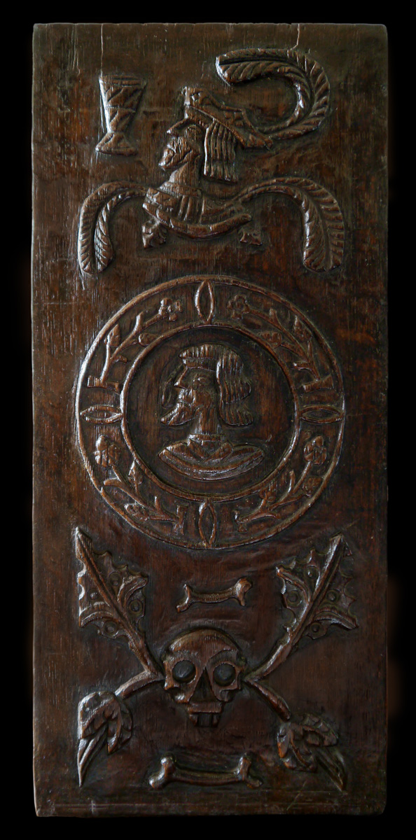 The second panel has portrait of a bearded gentleman within a circular foliate border. Above is a second portrait, this gentleman, looking quite aloof, sports a fantastic Tudor cap, with ornate feather decoration, looking longingly at a beaker, possibly pewter, and in his mind full of mead.