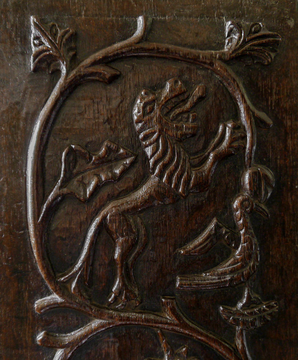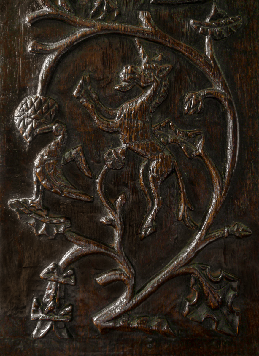 Both of rectangular form, the first panel has a horizontal scrolling leafy stem, with a wonderful standing lion in the upper half. Below, and facing in the opposite direction, is a unicorn, again in a standing position. A couple of birds – perhaps storks (the stork, heron and crane are all symbols of love, hope long life or prosperity) – are carved amongst the foliage.