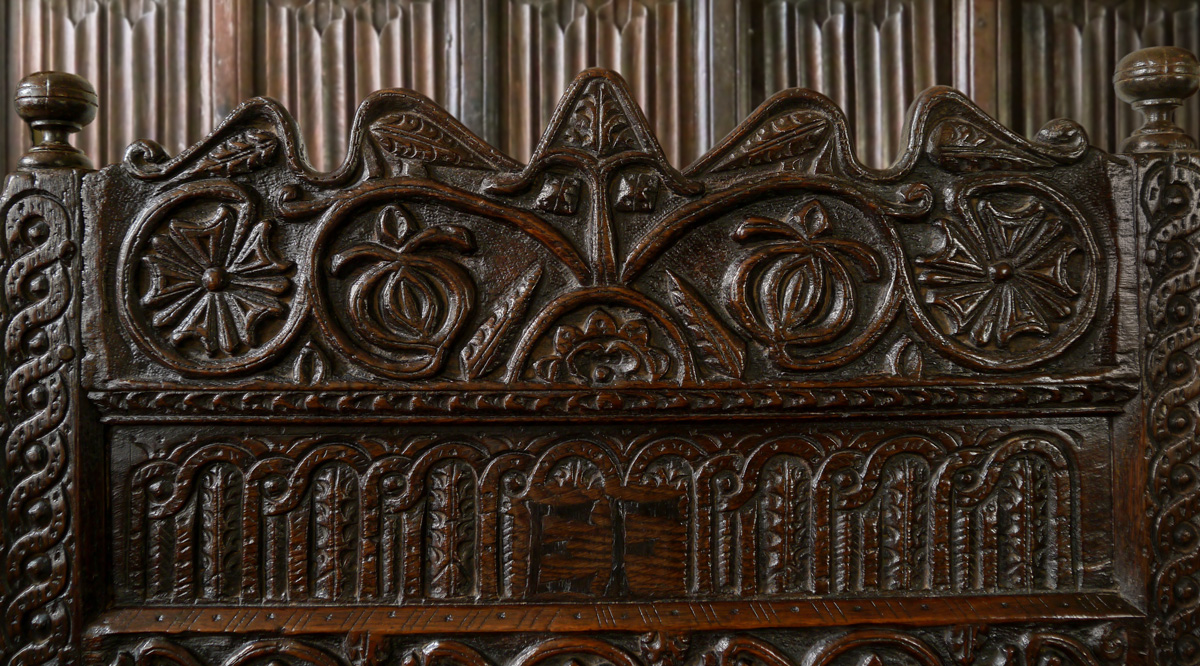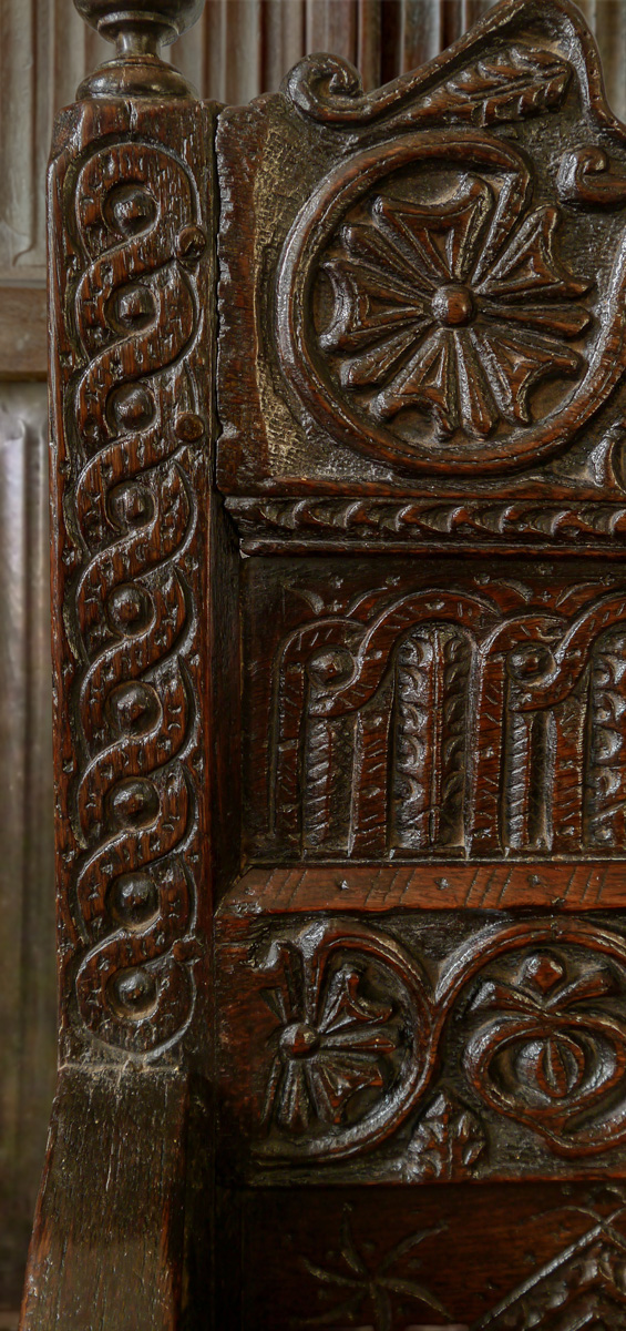 The horizontal upper panel is carved with a “run” of higher and lower arches, each filled with an upright stem, supporting leaves. The centre of the panel is inlaid with the owner’s initials “E E”, in holly.