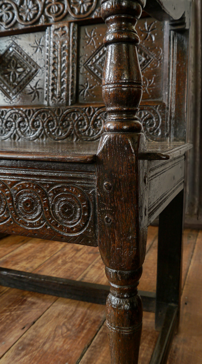 The twin bottom panels are square, each with a lozenge flanked by whorls in each corner, and further embellished with stamped decoration. The bottom rail of the back, and seat rail, are again decorated with embellished carving.