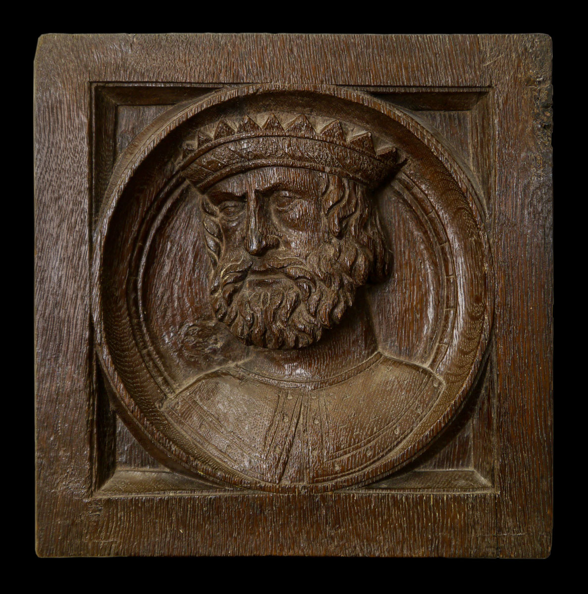 Each panel exceptionally deeply carved, the male head, possibly a crowned King, shown within a roundel. The female, again in a deep roundel, wears a close-fitting cap, or coif, is possibly a Queen.