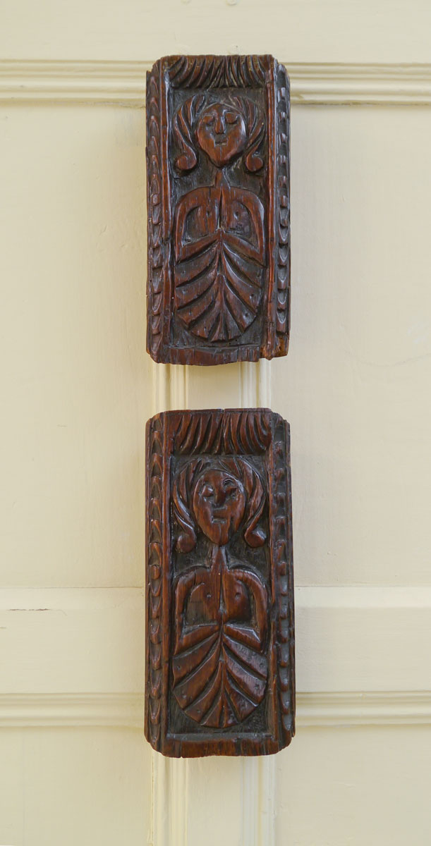 The two figures would form part of the framework of an oak chest – known as muntins, they would flank the top horizontal panel on a very elaborate piece of furniture, normally having three panels along the top and five panels below.
