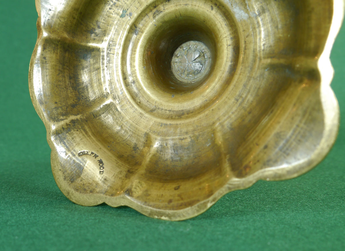With brazing lines running from the sockets down through the stems. Interestingly, although a totally matching pair, one candlestick is stamped by the maker George Grove, whilst the other is stamped Joseph Wood. This would seem to indicate that both makers enjoyed a close working relationship. The combination of the two names has been traced on other pairs – see Eloy Koldeweij’s The English Candlestick, page 113, catalogue 87.
