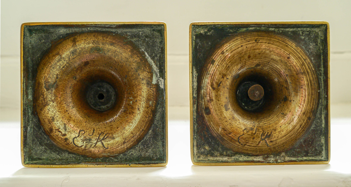 The square bobeche, matching the dished square base, with an elegant slightly tapering stem.