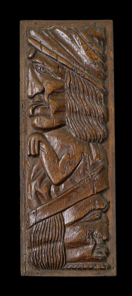 Probably forming part of a church’s panelling, these “warning symbols” served as a visual reminder to the congregation – who probably could not read – of the sins they may succumb to.
