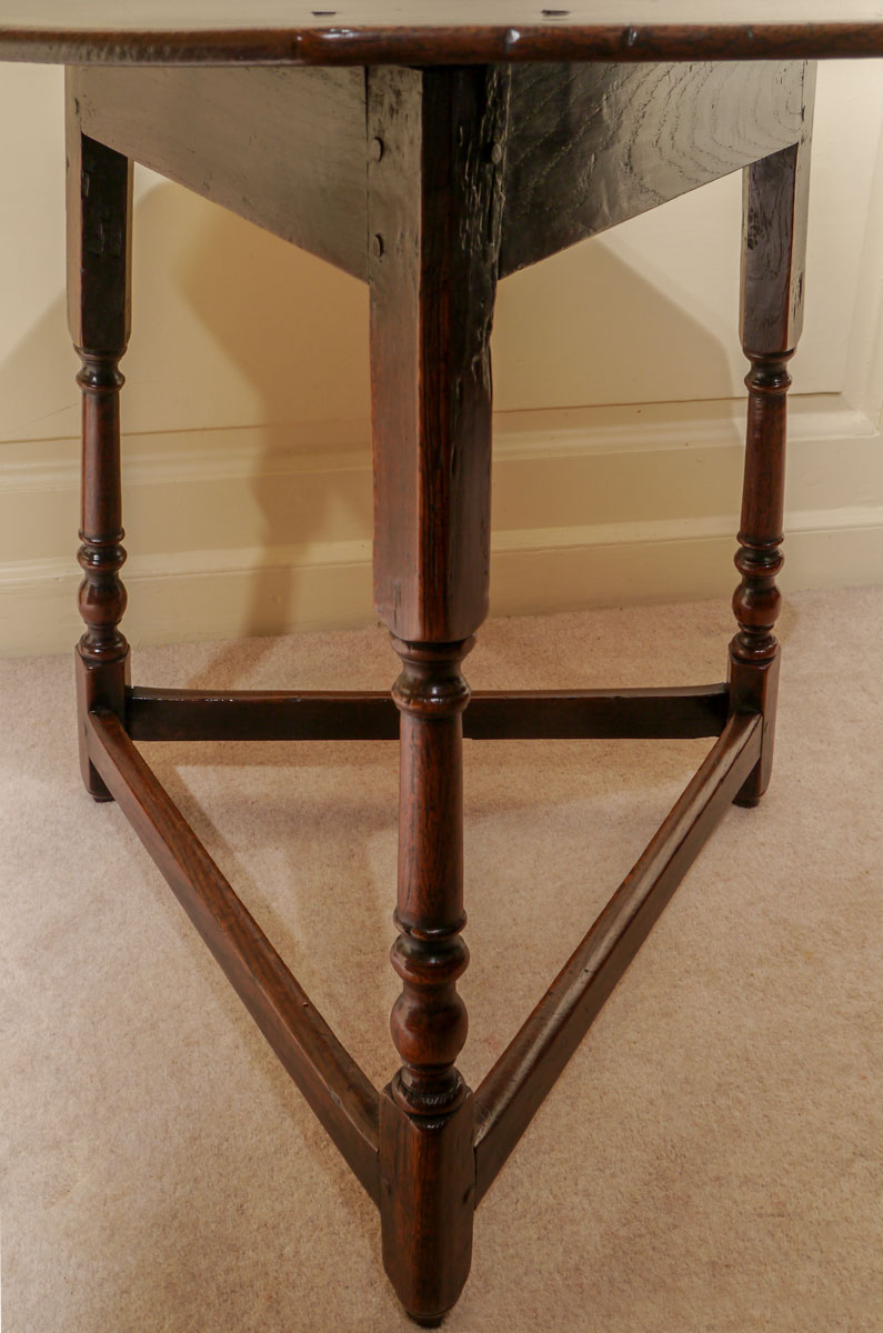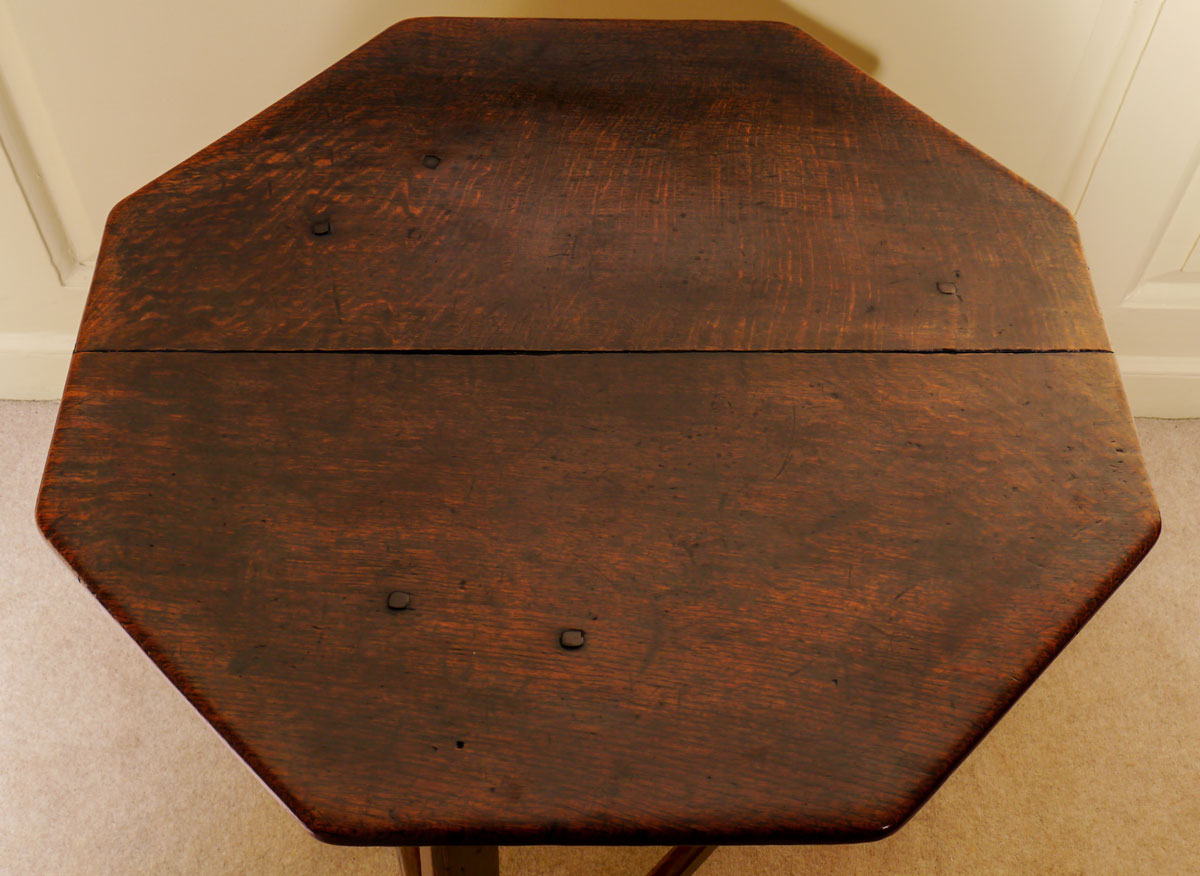 Having a most unusual octagonal two-plank top, secured to the underframe, with beautiful original square dowels. The well-turned baluster legs, joined by all-round stretchers, terminate in the original toes.