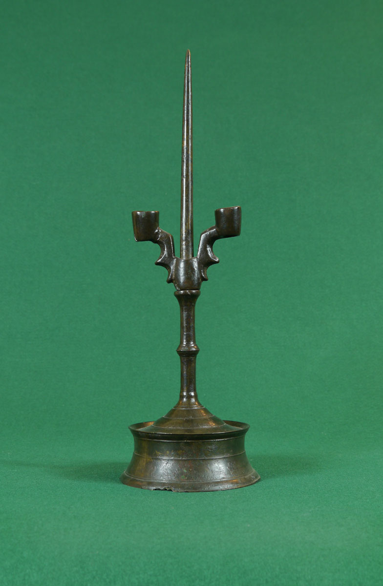 This beautifully patinated candlestick has a tall central pricket, with a ring-turned base, upon which sits the twin nozzles. The stepped base is decorated with narrow ring-turnings and a shallow rim for catching spent wax.