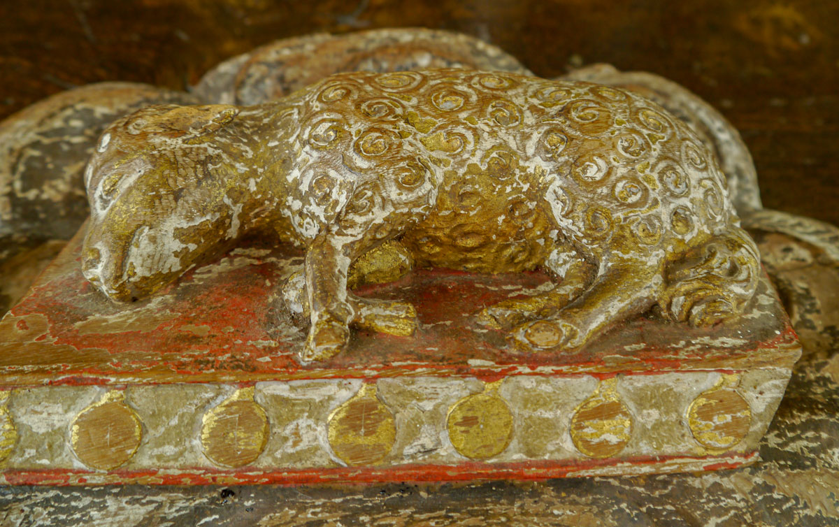 Carved in beautiful detail, the lamb, with tight curls of wool, lays on a book – possibly the Bible (the boss would certainly have originated from an ecclesiastical building), which in turn is surrounded by scrolling clouds.