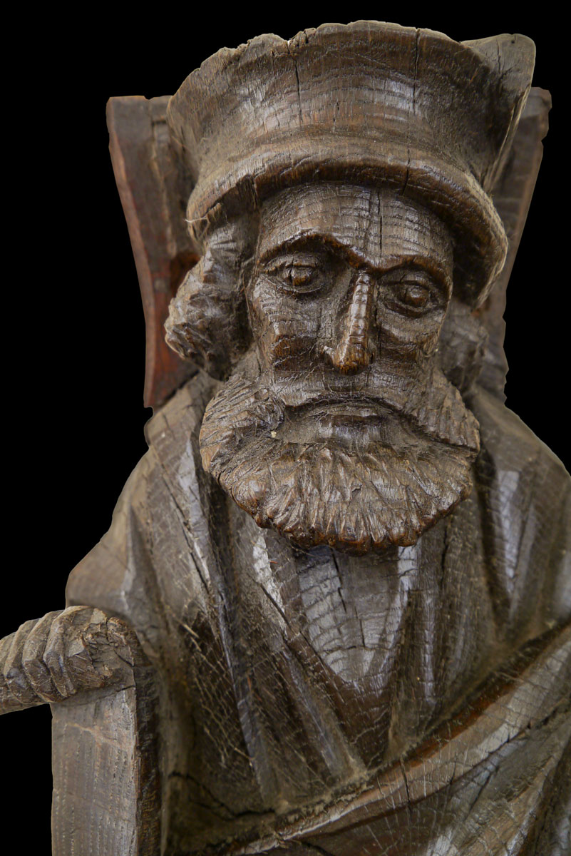 Carved in great detail, the male with slightly inclined head, and gentle facial expression, sports a full beard and curly hair, which escapes from under a flattened hat. The full-length figure is wearing a gown, which he gathers in his left hand, and holds the end of a scroll in his right hand.