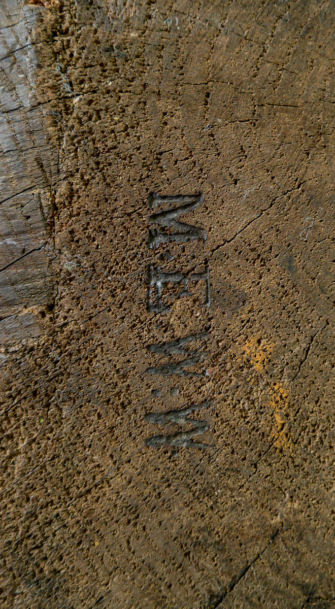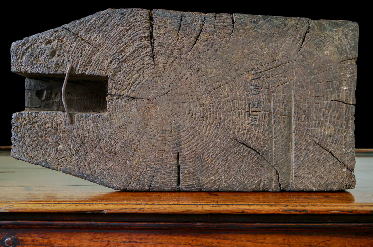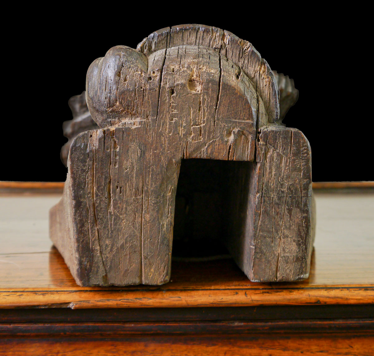 Both figures would have been part of horizontal structural roof beams, and retain the large mortices, into which the roof joist tenons would have been housed. Almost certainly, the original building they were from would have been secular – and important – rather than ecclesiastical.