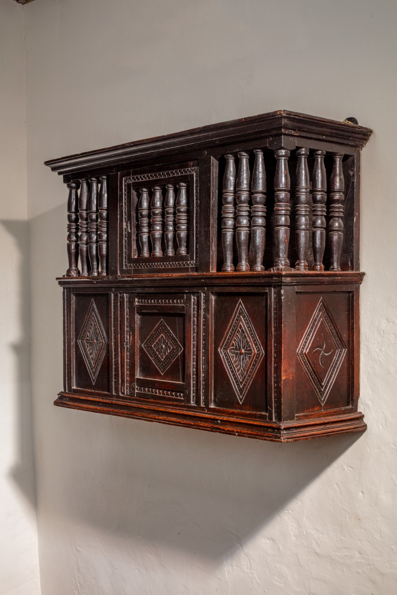 A beautiful early seventeenth century oak wall hanging cupboard. The upper section, with turned ballusters incorporating a central door, the panelled base with lozenge carving (the panelled ends are carved in the same manner). The central door with a simple "chain carving", which matches the door above. This type of carving, together with the lozenge, would suggest this piece originated in Wiltshire. The colour and condition are both excellent; the oak having a lovely original skin.