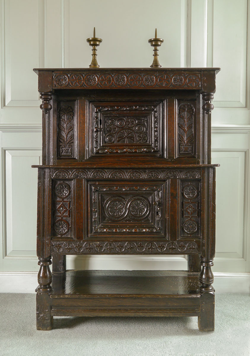 Possibly unique small oak cupboard, which was made in south Gloucestershire/north Wiltshire. The top rail with distinctive carved roundels, alternating between a stylised star and daisy head motif, terminating in small well-turned pendants.
