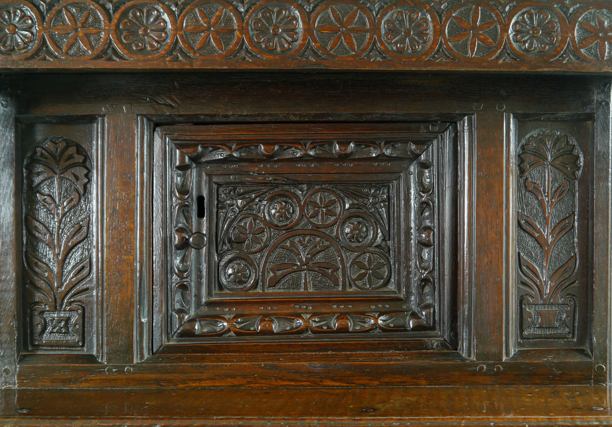 The single door to the top has a deeply recessed panel, with very well-moulded framework, and is carved with a single arch made up of small roundels. To either side of the centre panel are small vertical panels with tall flower-like devices supported on a stem with fleshy leaves. Inside the top cupboard is a concealed compartment with access through the floor of the cupboard.