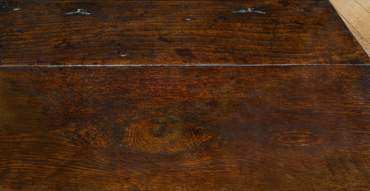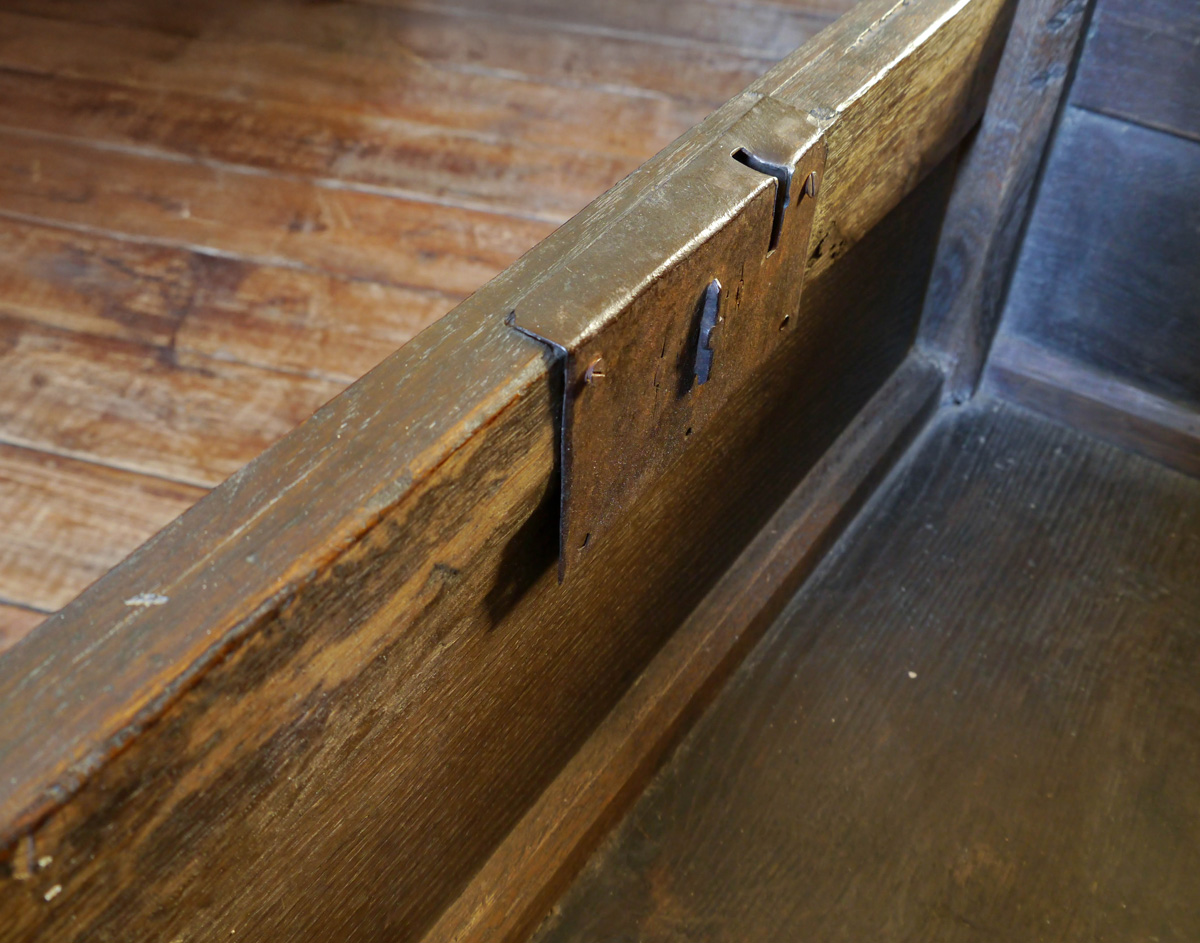 The twin boarded top, lifting on the original iron pin hinges, reveals a vacant interior with a single board forming the base.