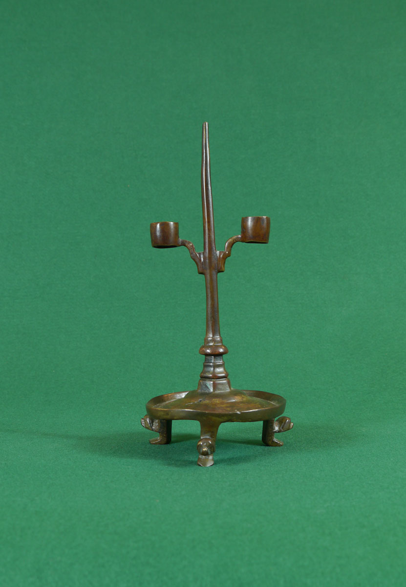 The central stem, which has both pricket and socket candleholders (depending on the quality of the wax or tallow candle), tapers down to a faceted knop, which sits above the upturned base/drip pan, which has integrally cast animal head feet.