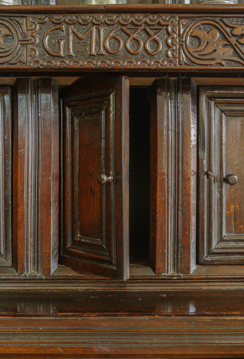 Retaining the original canopy which has a panelled back and well-turned baluster front supports. The centre section has a carved top rail terminating in well-turned pendants, whilst the rail itself is carved with leafy āSā scrolls and bearing the initials and date GM 1688. Two cupboard doors, with decoration made up of complicated mitred mouldings, are set either side of a narrow door opening to a narrow compartment.