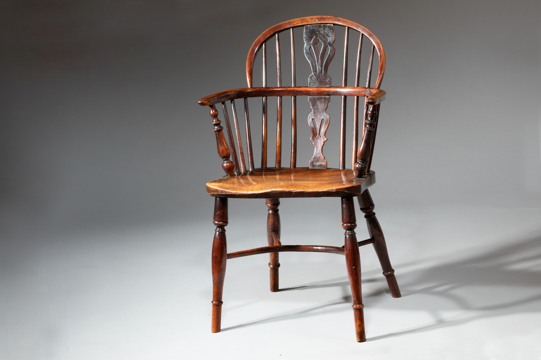 A Rare Low Back Yew Wood Windsor Armchair Stamped Wheatland, Rockley