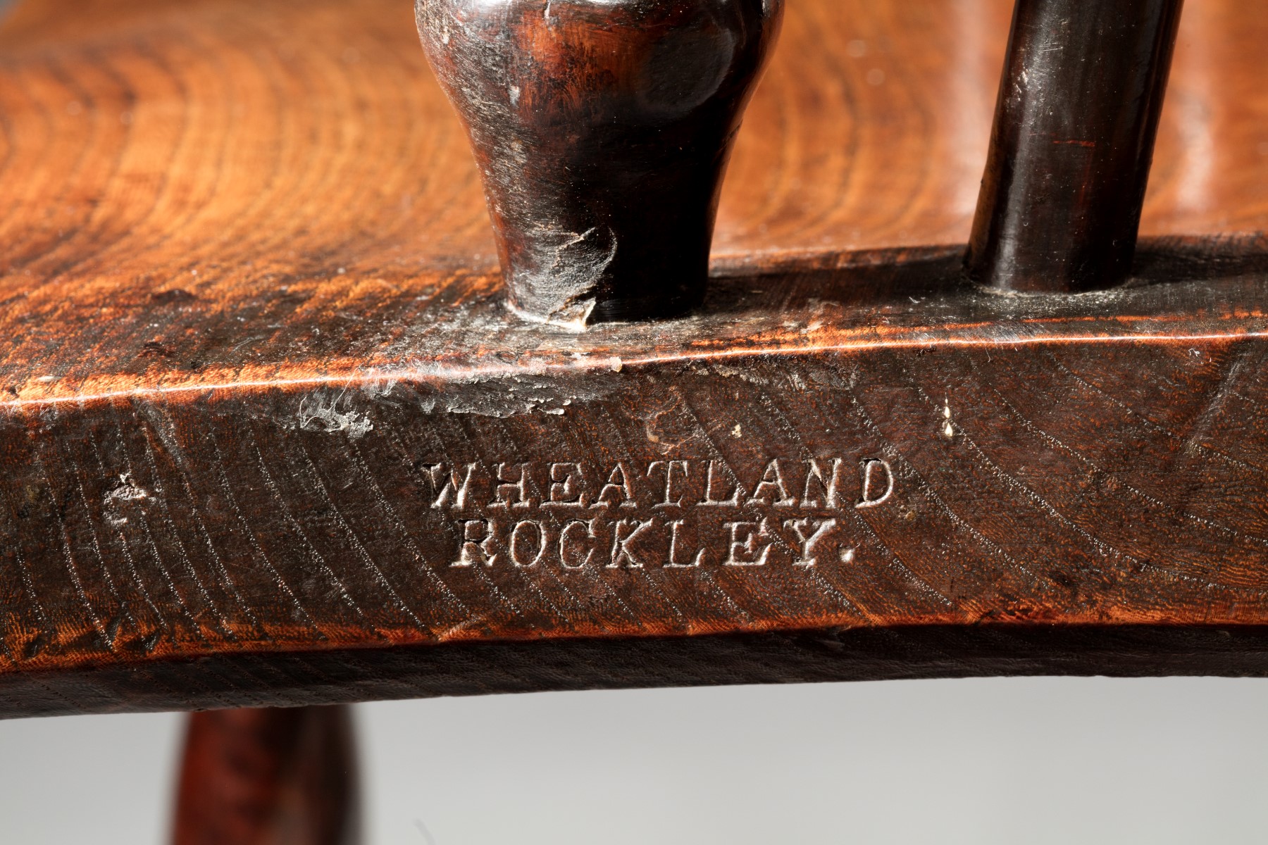 William Wheatland moved to Rockley in the early 1820s to take up a position as leader of the Weslyan Chapel. He continued his trade as chair maker and started the Rockley tradition of chair making. This chair is of particularly fine quality, made from well-figured yew wood, with a dished elm seat. The single-ring turned legs - which are a feature of these early Rockley chairs - are joined by a crinoline stretcher. To the edge of the seat is the deep stamp Wheatland, Rockley (fl 1822-1828).
