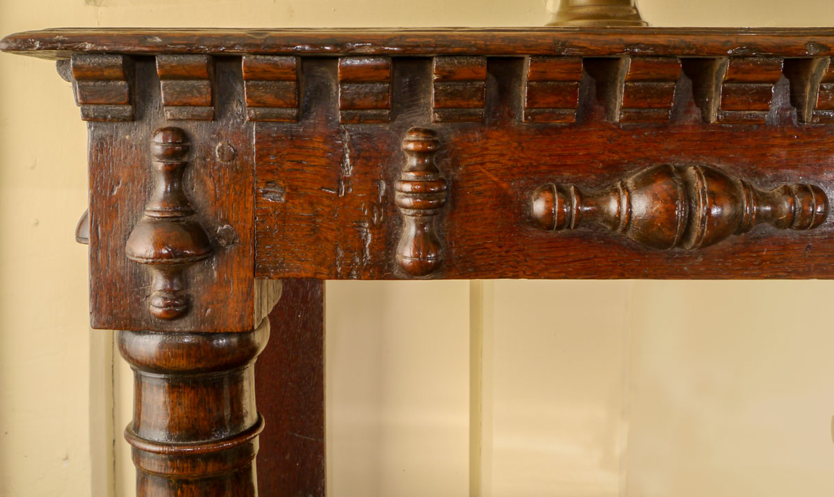 Below the centre shelf is a side-hung drawer, which again has turned balusters to decorate the front, whilst the bottom rail is left plain.