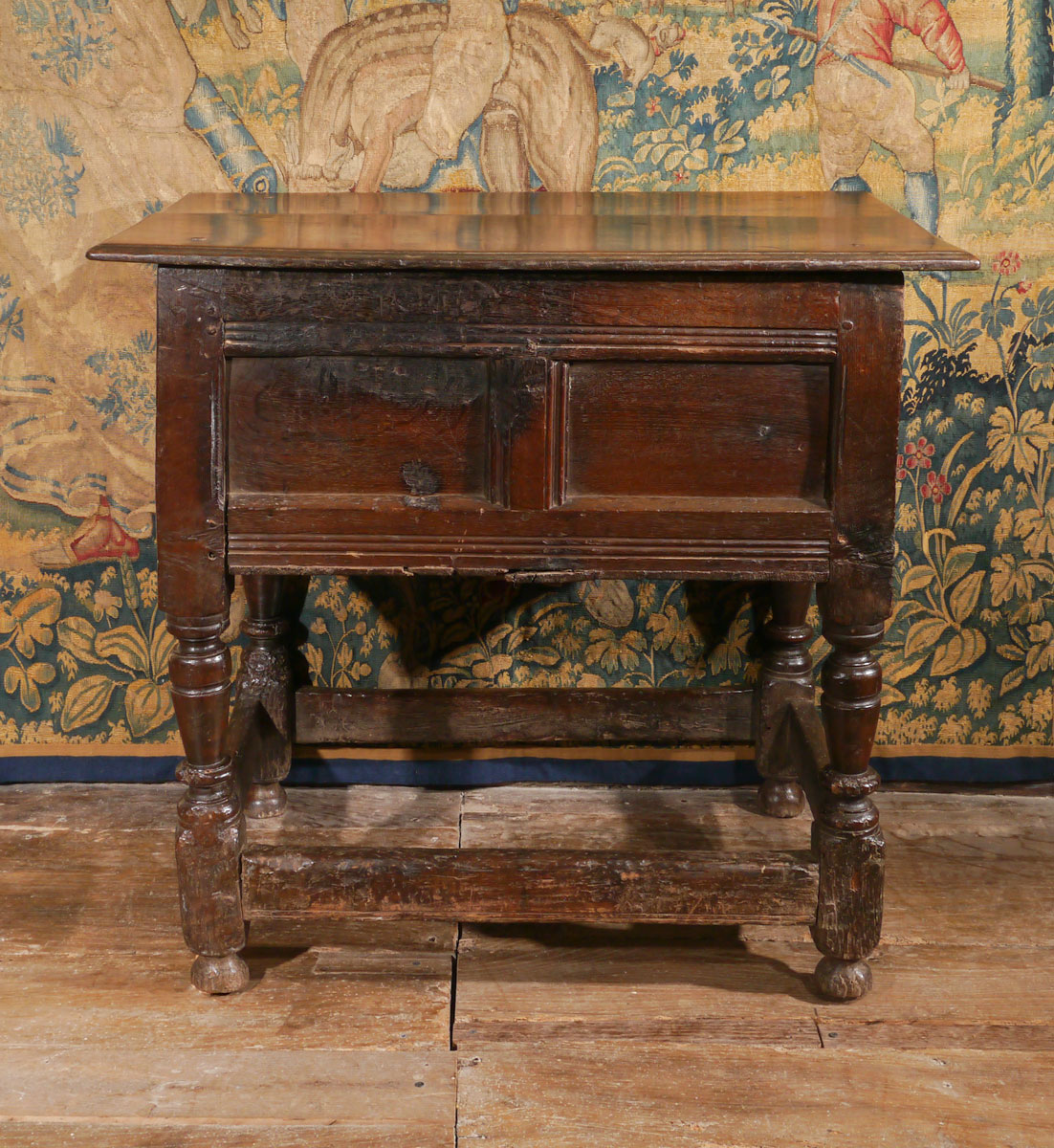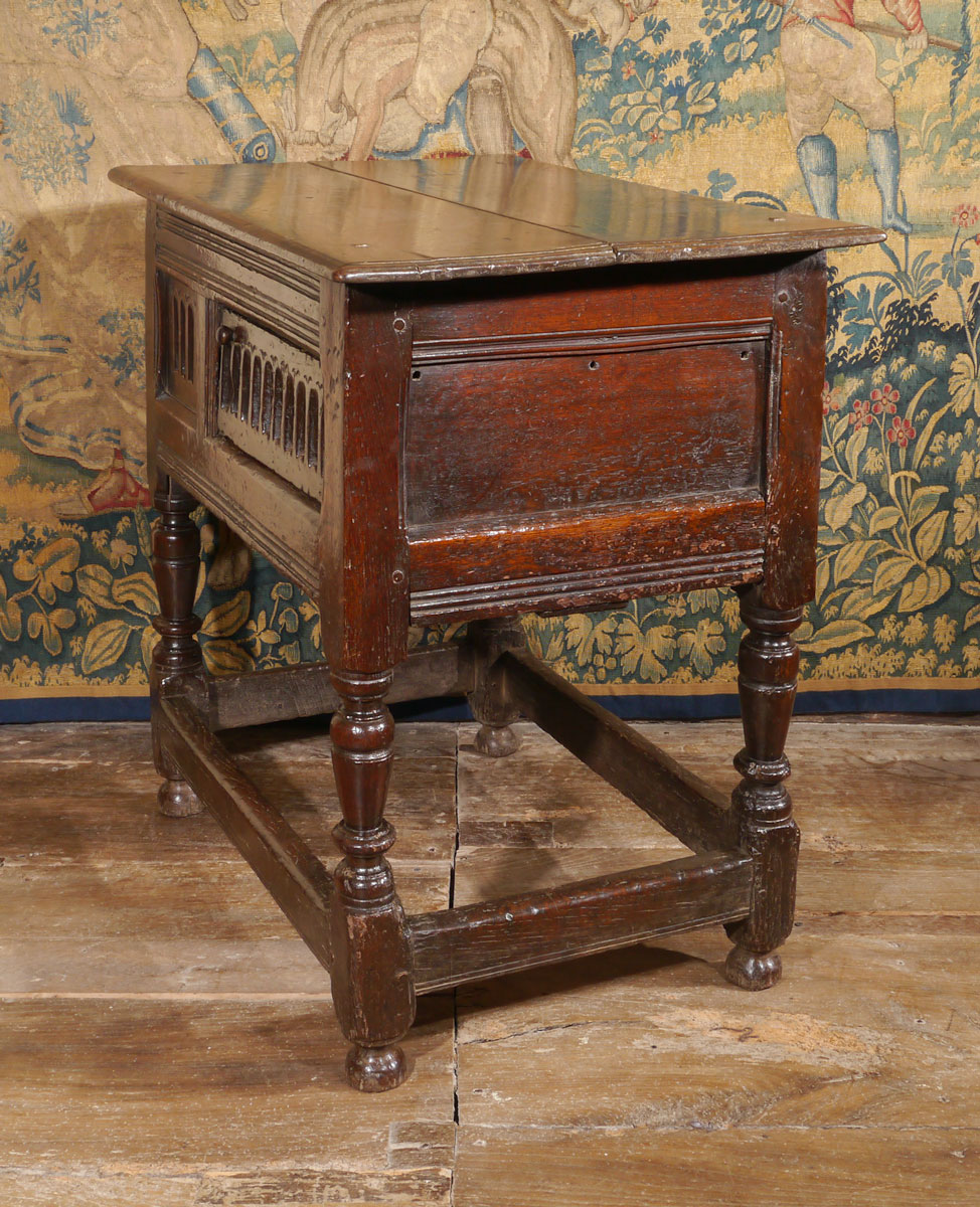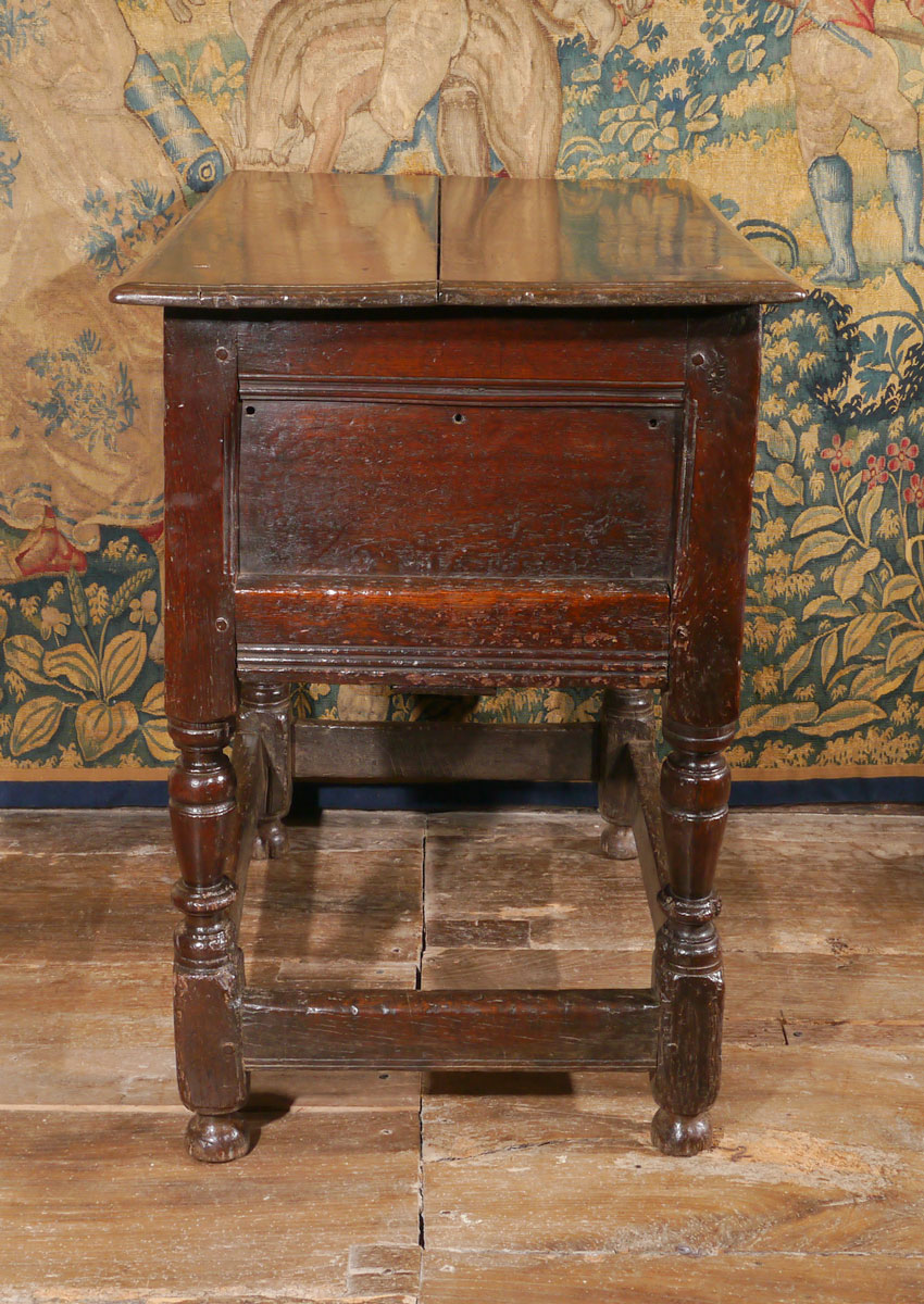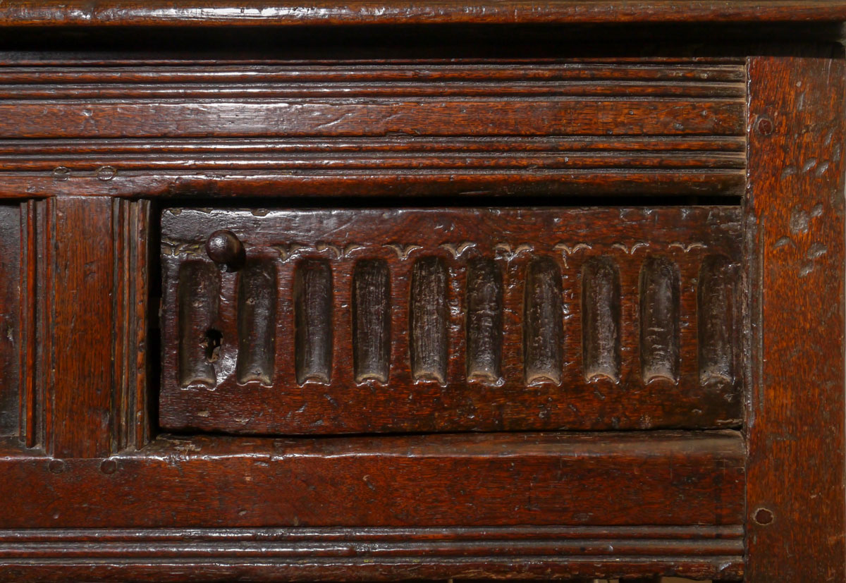 An outstanding piece of early 17th century English furniture. The twin boarded top above a gouge-carved front, containing a small panel and hinged door, which opens to an interior with concealed lipped shelf behind the single panel.