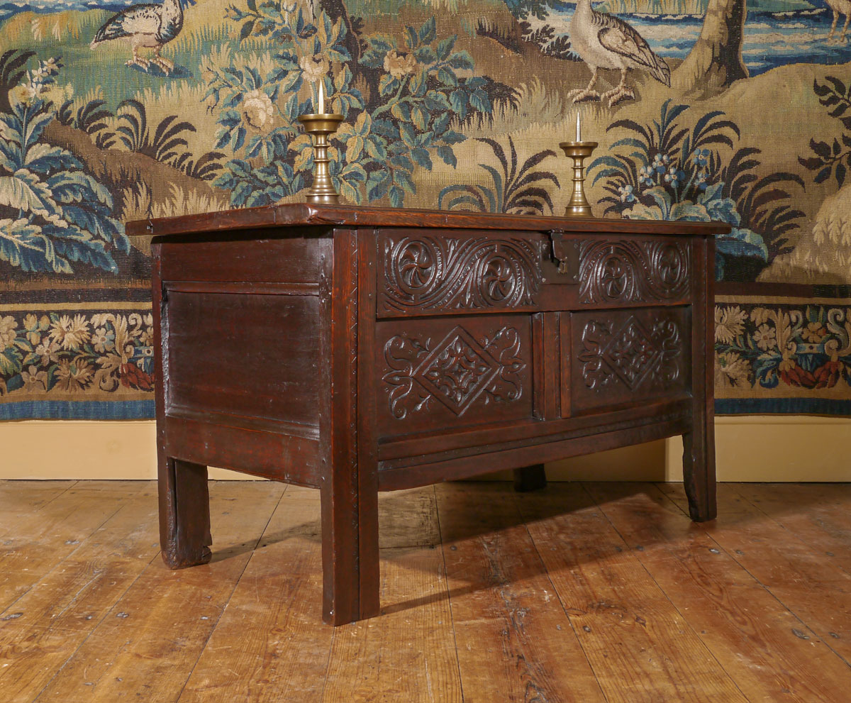 The three-panel lid, retaining the original pin hinges, above an exceptionally deep top rail, which is boldly carved with a trailing āSā motif, and symmetrical whorls, and retains the original iron lockplate. The two panels have a lozenge carved centre, with stylised tulip heads coming from the pointed ends. The stiles, muntin and bottom rail are all decorated with a flat run-moulding, with punched decoration.