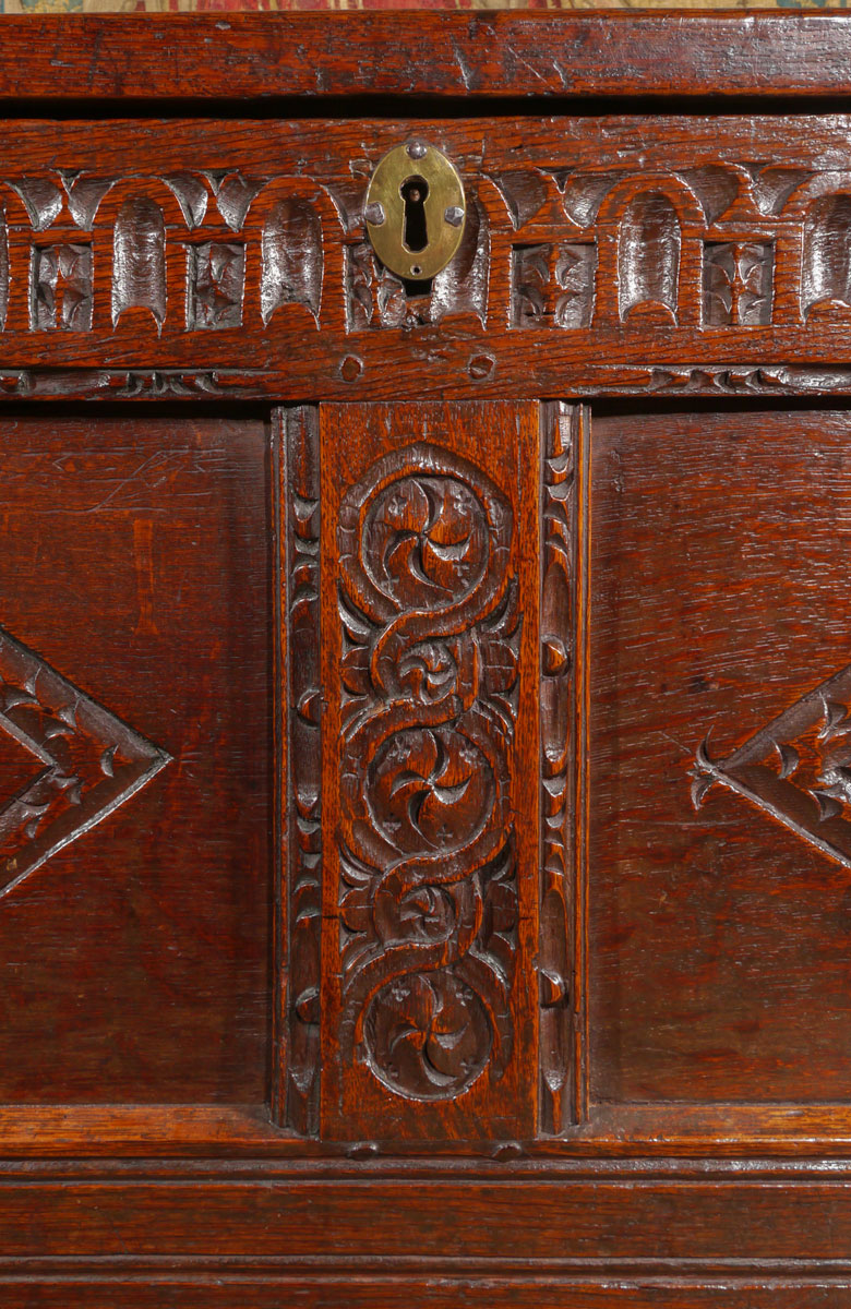 The two panel lid set within a run moulded frame. The front with a thumb or gouge carved top rail, which is repeated around the sides. The centre muntin, which has a vertical line of guilloche carving, divides the two lozenge carved panels, which unusually have different stylised flowers to the centres. The panel to the right is a Tudor rose, whilst the panel to the left is a daisy head.