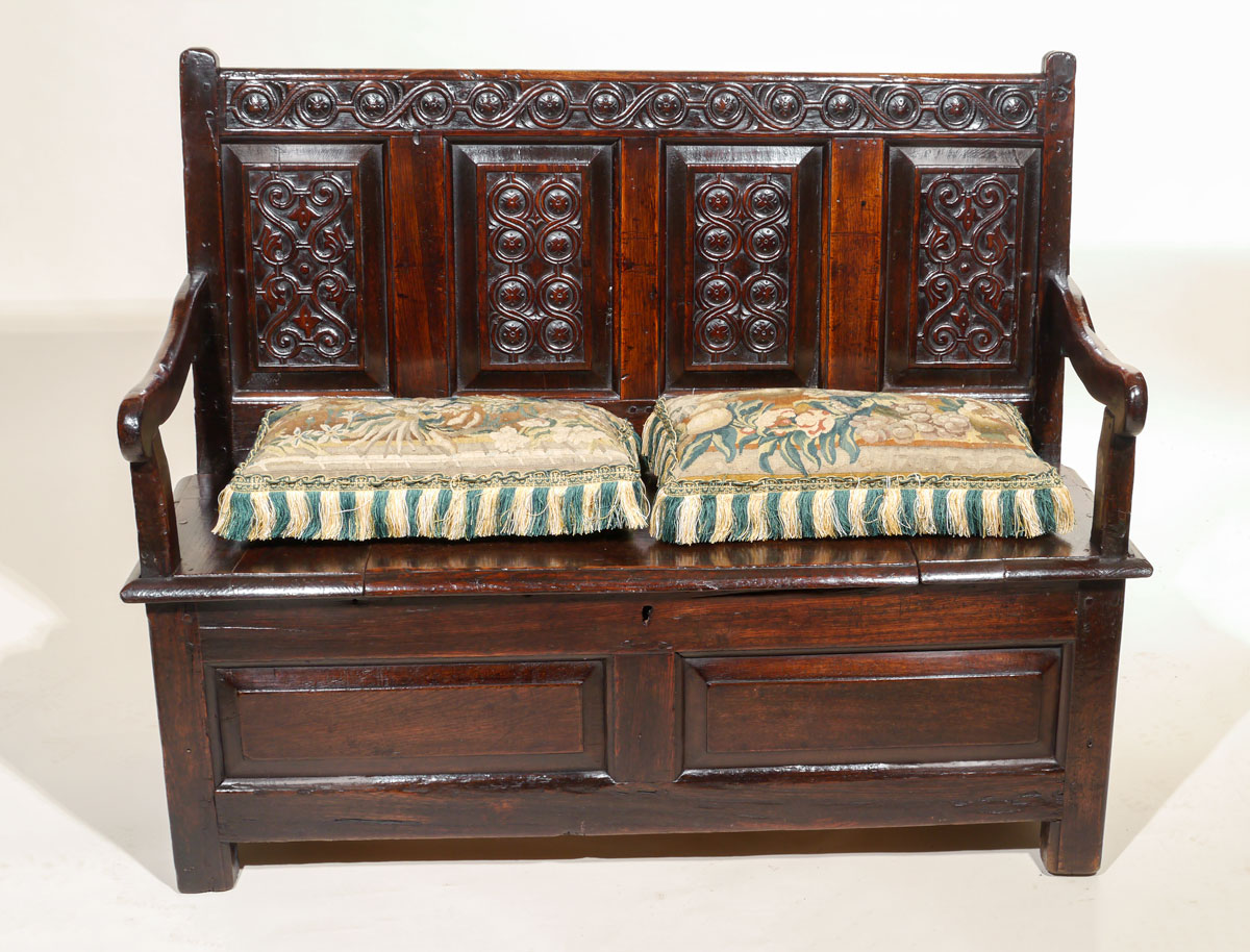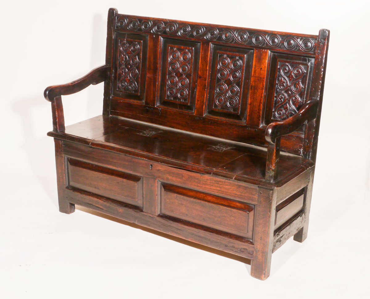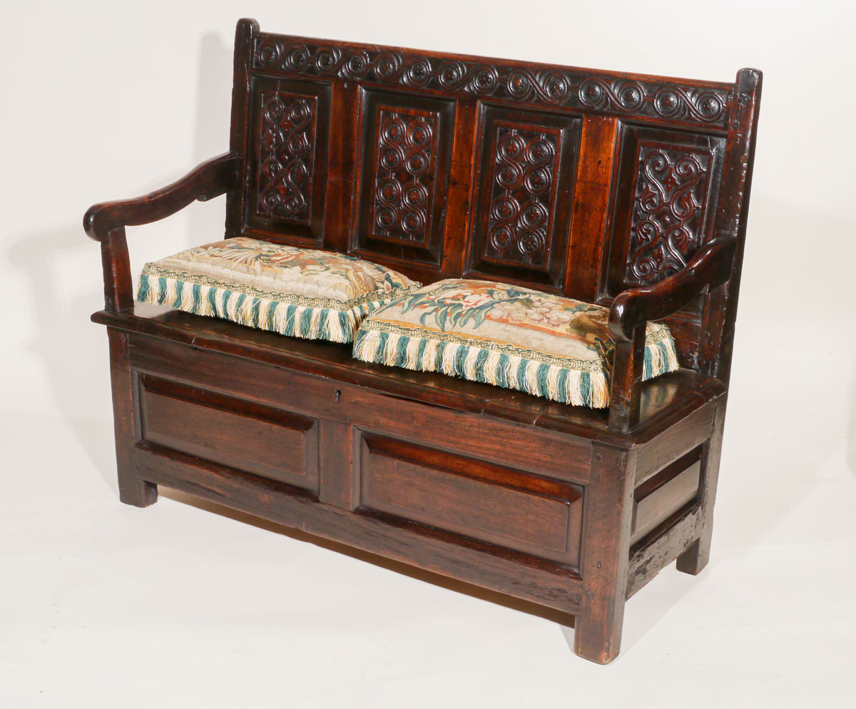 Having a carved, four panel back, below a floral guilloche carved top rail, set within plain uprights. The box base, with boarded seat, is enclosed by simple, raised panels.