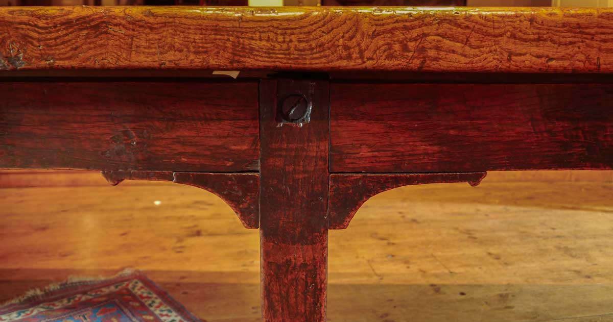 The top is supported on the original six-legged oak base (elm would not have been used to form the legs as it does not stand well on damp floors), which has corner brackets between the horizontal frame and vertical leg.