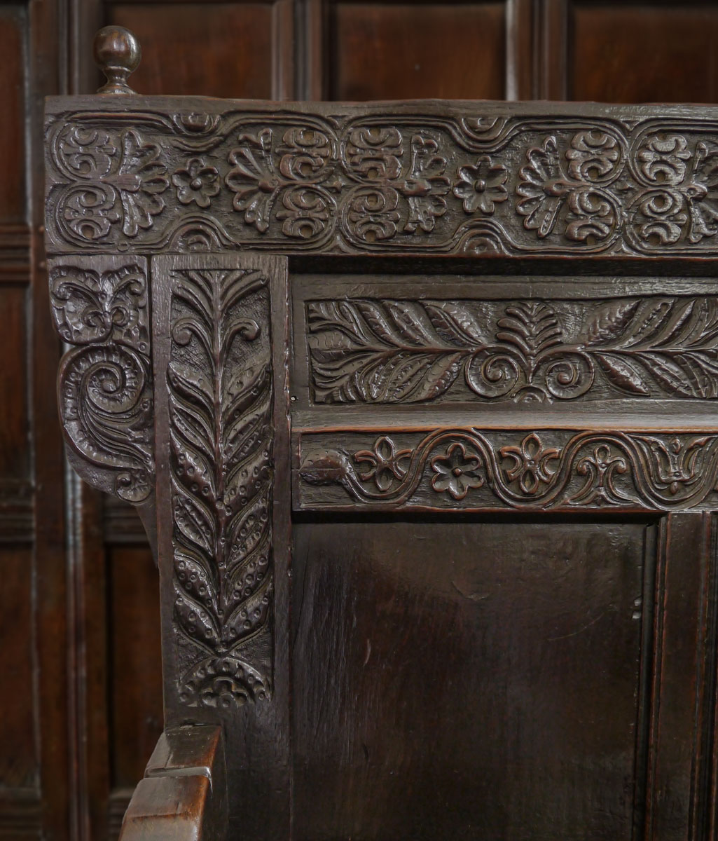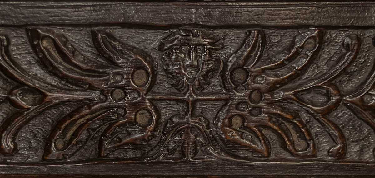 Below the top rail are four horizontal panels, the outer two with further carved leaf and flower designs, whilst the centre two have a small bearded face, with foliage extending along the arms – perhaps a symbol of the “green man”. The centre rail of the piece has a continuing and undulating carved design – the top section is finished with a pair of tight scrolled “ears”.