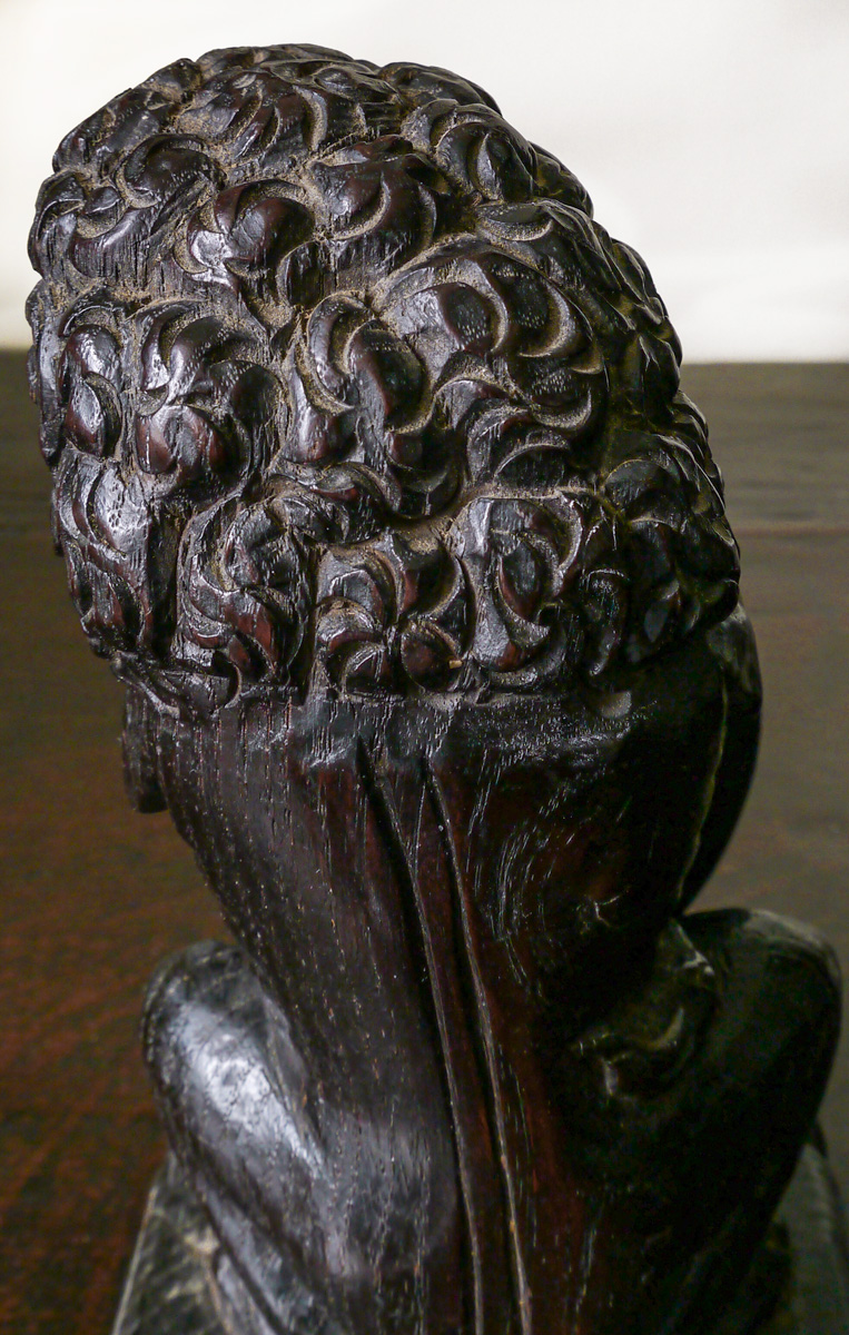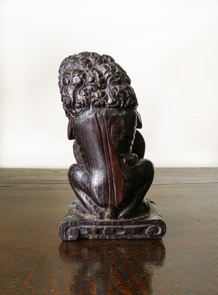 I don’t think this little chap would have sat atop of a staircase newel post, but rather have been the decoration for a piece of Elizabethan furniture, such as is pictured in the book press below, which was sold in the Butler Collection, March 2020, at Bearne’s in Exeter.
