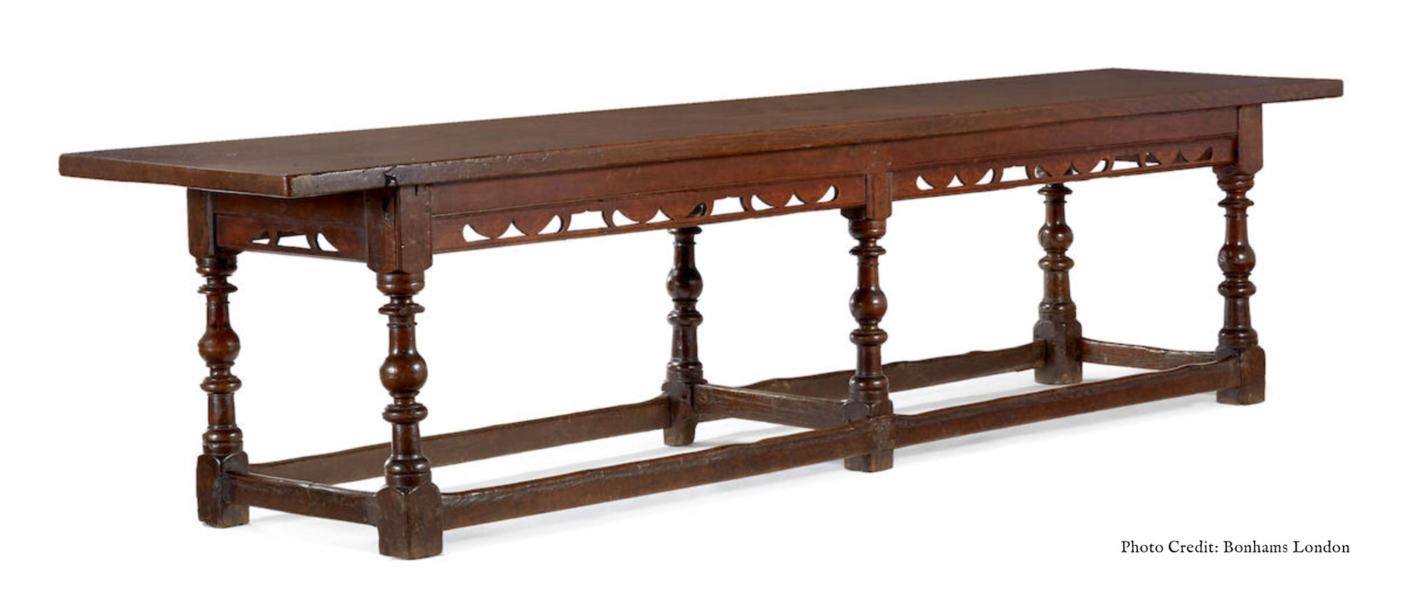 A fine and unusual stool, from a very skilled workshop. A similar period refectory table, probably from the same workshop, was sold in Bonhams Oak Sale, 28th September 2016, lot 242, illustrated for comparison.