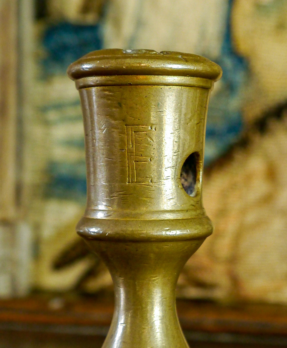 On the right, an early 17th century bronze candlestick, having a very slight flared socket, with circular piercing. Bearing an engraved owner’s initial “E”, above a simple “tear drop” shaped baluster shaft. Typical bell-shaped foot, with pronounced ring-turn decoration.