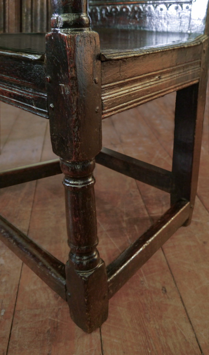 The down curved arms rest on bold turned supports, which continue below the single board seat to form the heavily turned legs, which are joined by equally heavy cross stretchers, and finish in a good turned foot, or “toe”.