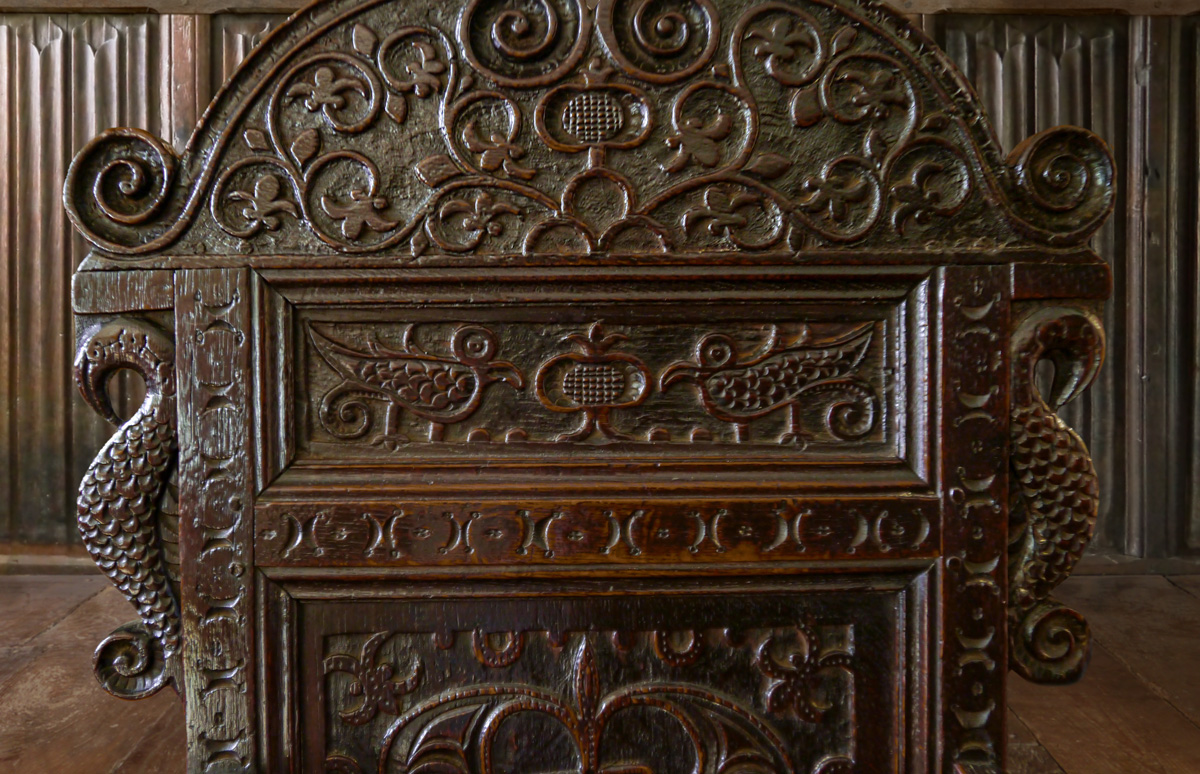The upper panel of the two-panel back has a pair of birds facing a second pomegranate, whilst the lower panel has a stylised central tree of life with leaves and flowerheads. The frame of the back has carved decoration, with a line of punched embellishments running centrally down the arms.