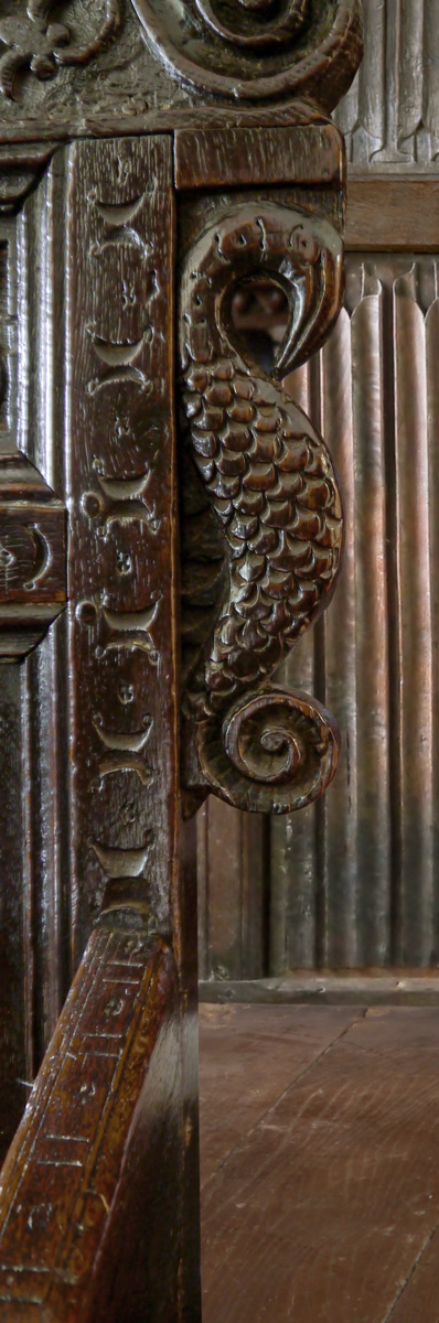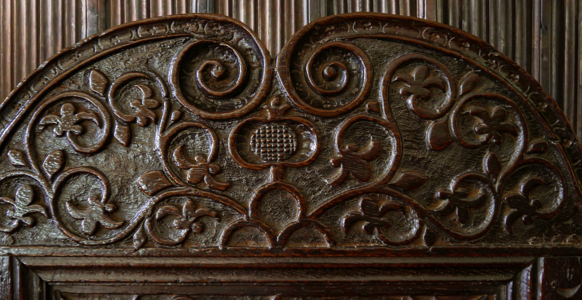 This example shows all the important characteristics – very fine linear carving, a good bold crest, this one displaying a pomegranate surrounded by scrolls and flowerheads.