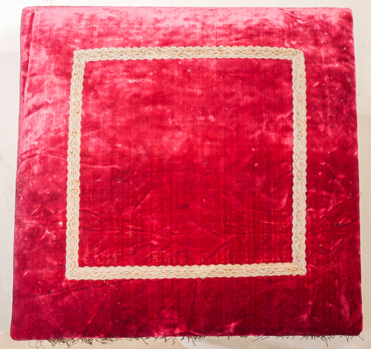 The well-turned columnar legs, with ring-turning at the top and bottom, joined by all round stretchers. The tops are upholstered in 18th century silk velvet and bullion thread braid.
