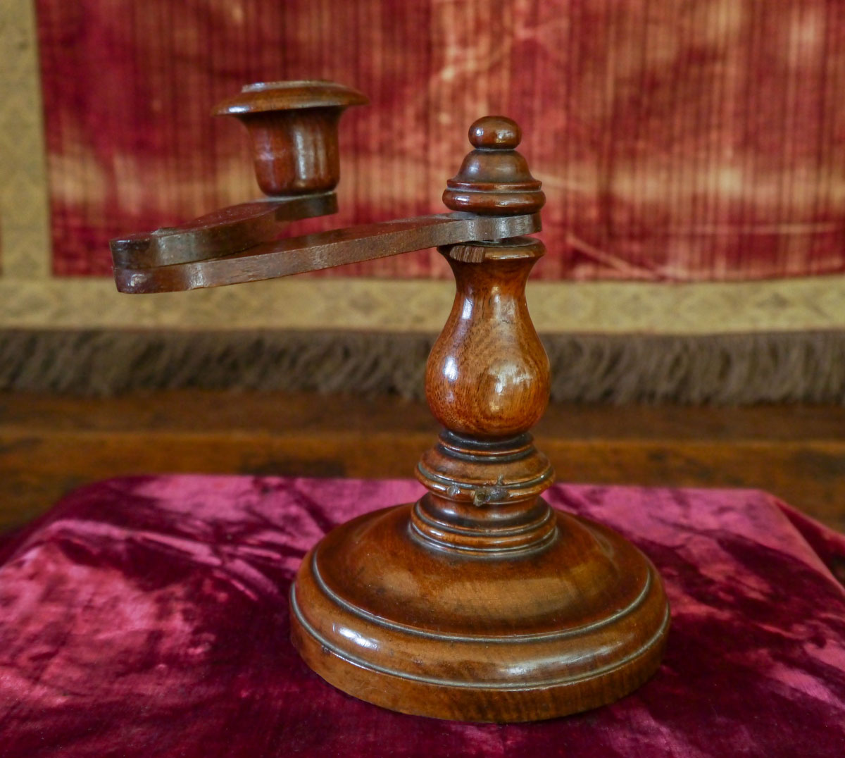 Probably made for use on a desk, or writing table, the candleholder is mounted on the end of a hinged arm, which swivels from a pivotal point at the top of the well-turned column, in order to achieve the best position for the light.