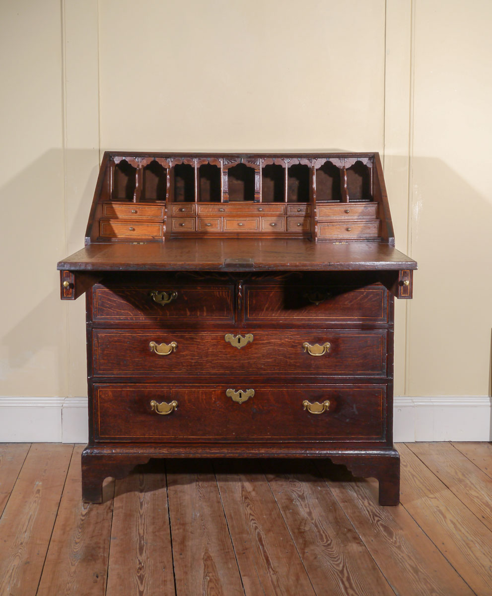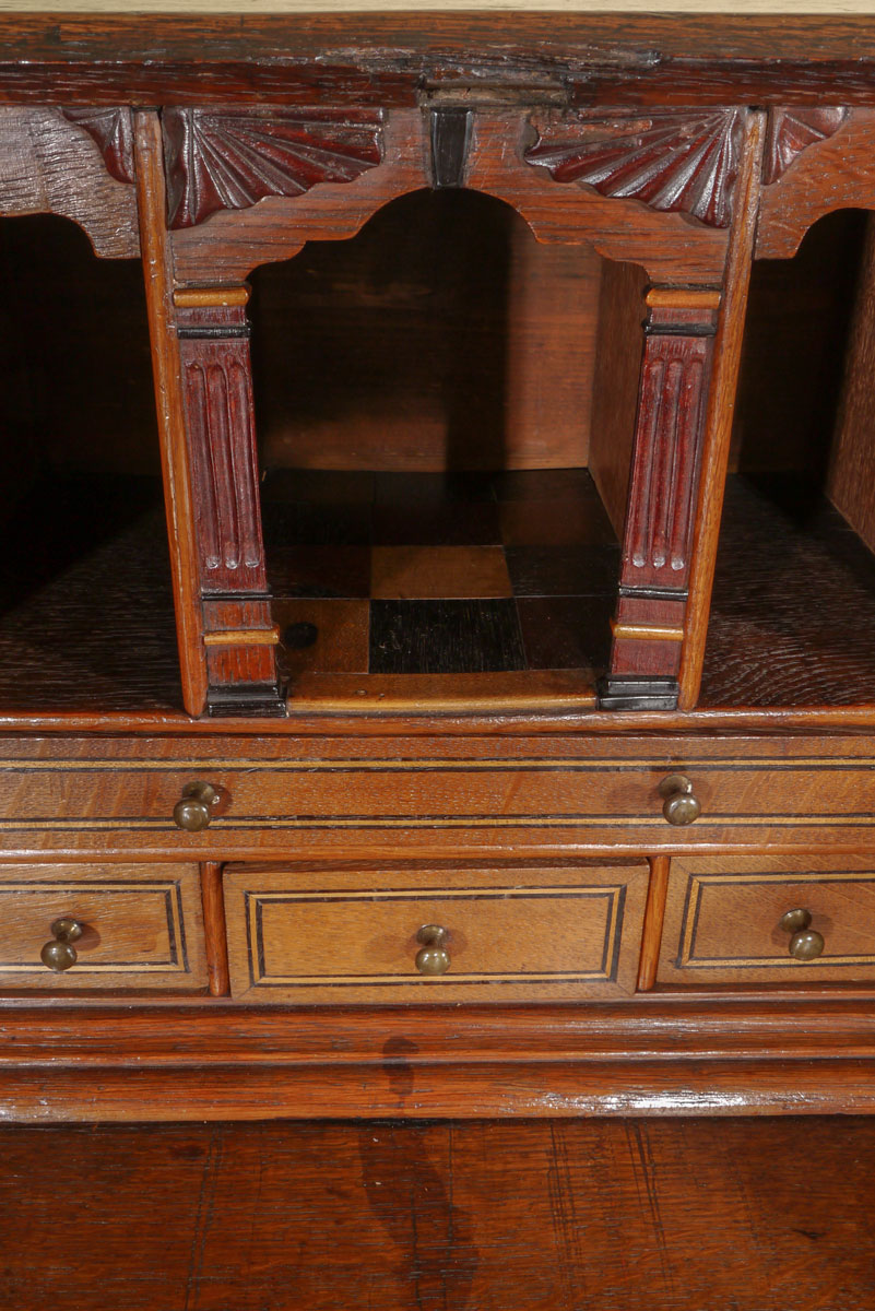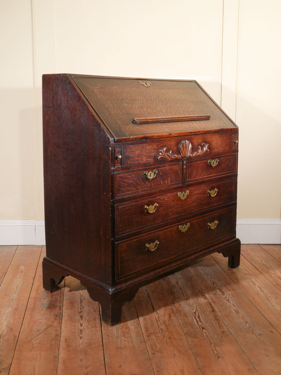 The single piece fall front, with an applied moulded bookrest, enclosing an outstanding fitted interior of pigeon holes, small drawers and a secret compartment, all decorated with line inlay and carved decoration, set around a central well. Applied to the top rail is a carved walnut festooned scallop shell, which sits above two short and three long drawers, again all decorated with line inlay.
