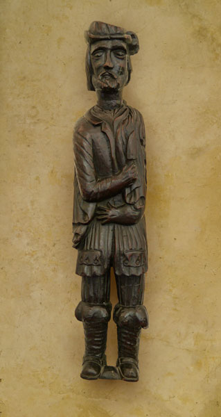 A severe looking gentleman, with neatly trimmed beard and moustache, his tunic well-carved with pleats and folds, over an apron hanging from his waist, and standing in knee length boots. In his hand, he proudly displays a knife – the tool of his trade.
