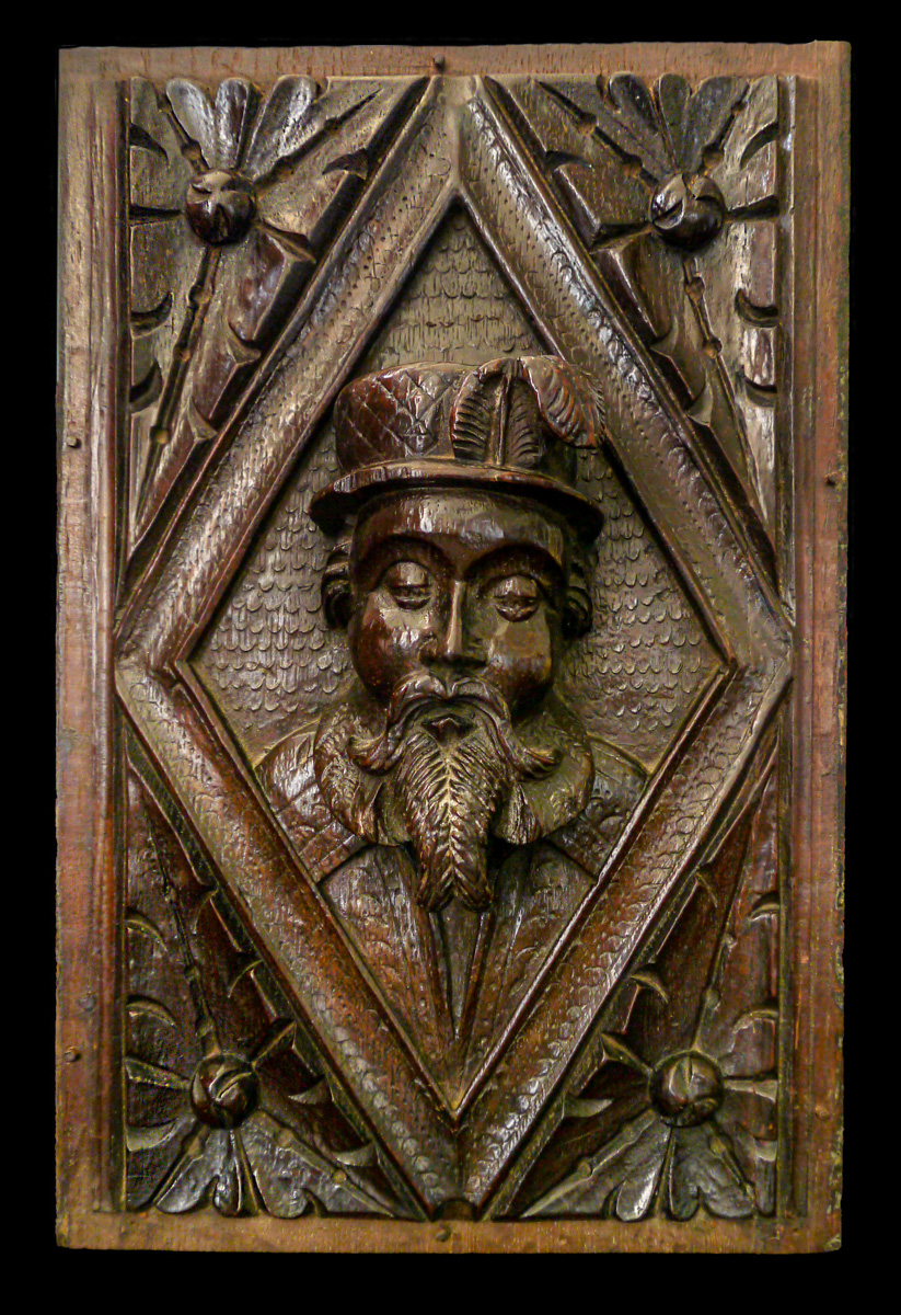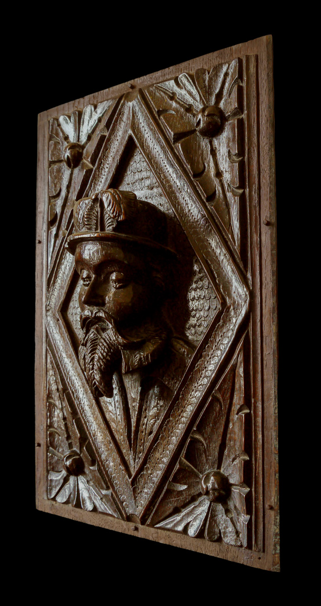 This kindly face is exquisitely carved, with fantastic detail and is integral with the background, which is embellished with tiny carved fish-like scales, which are repeated along the recessed moulding of the lozenge frame. The corners of the panel are filled with stylised oak leaves, with a central whorl.