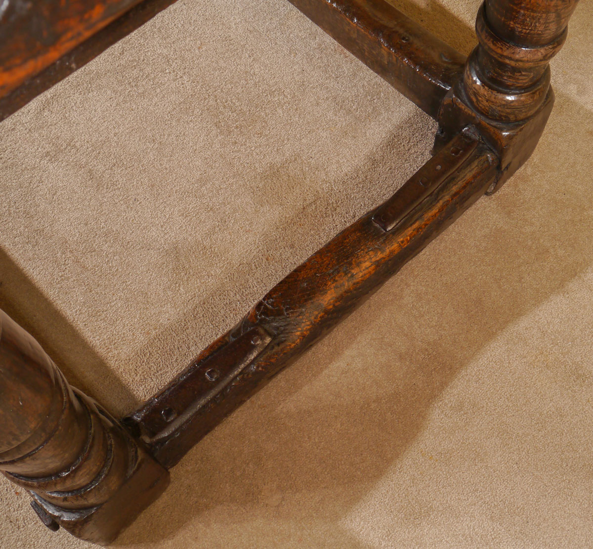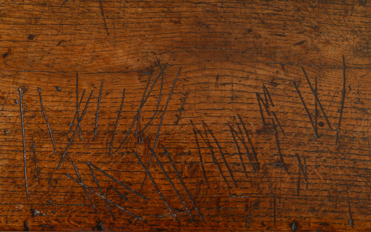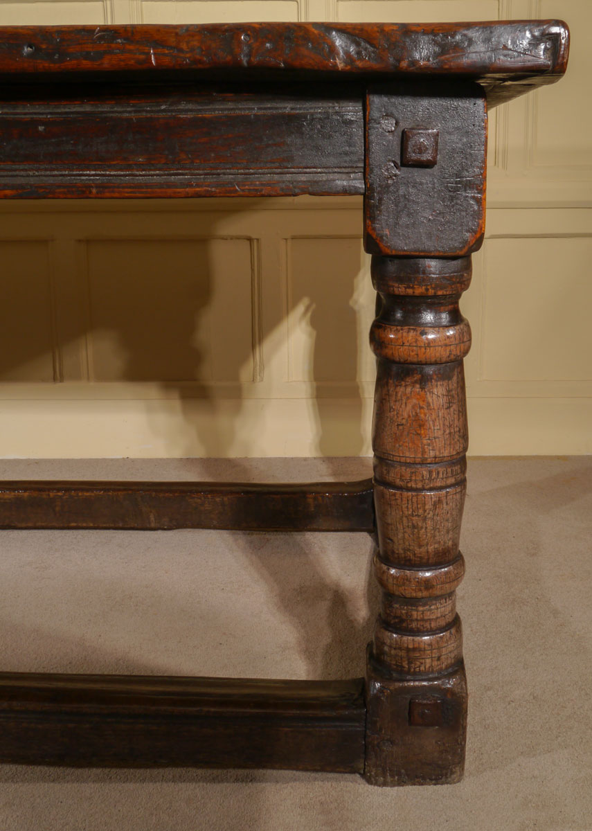 A most charismatic early 17th century table. The thick boarded top, with inset end cleats, has been marked for the game shove ha’penny, an indication that it if not made for use in a tavern, certainly spent some time in such an establishment. The four heavy baluster turned legs are joined by square stretchers around the base. Adding to the character of the piece are the iron corner brackets, which have been introduced during the 18th century to stop the frame from moving – again, an indication that it was used in an inn where the gamblers would lean over or push against the table during their games of shove ha’penny.