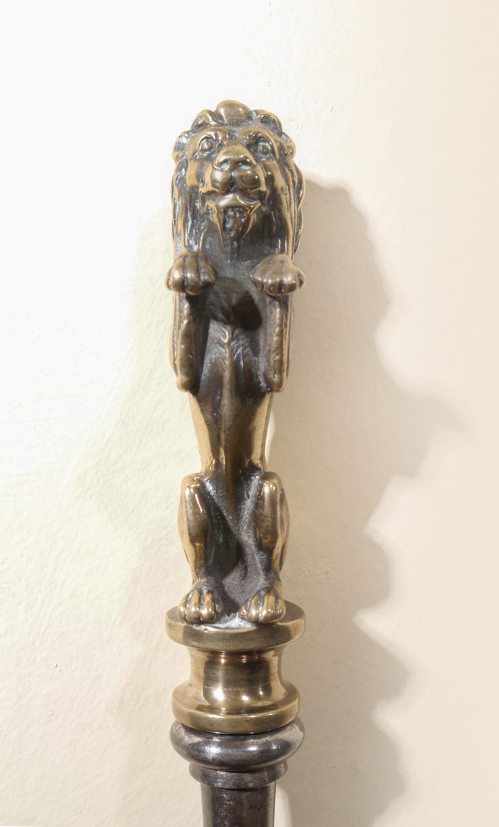 The tongs, poker and shovel constructed from heavy burnished steel, each surmounted by cast brass lion sejant finials.
