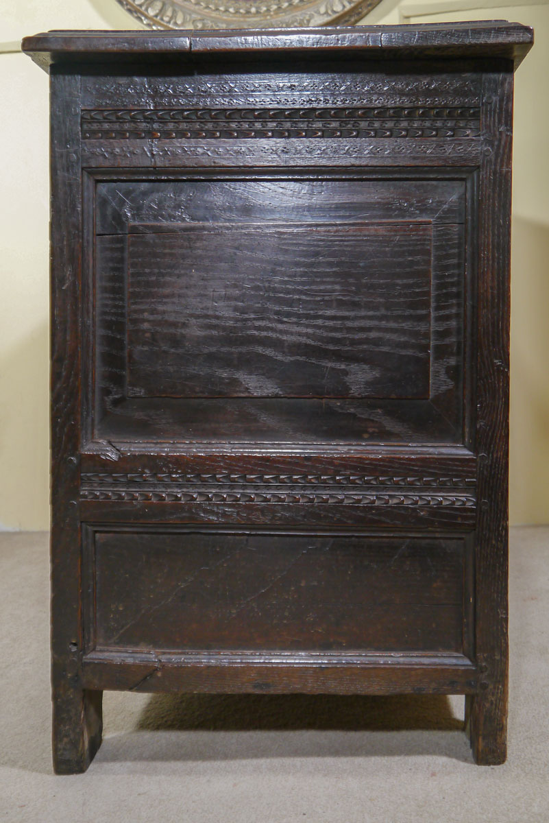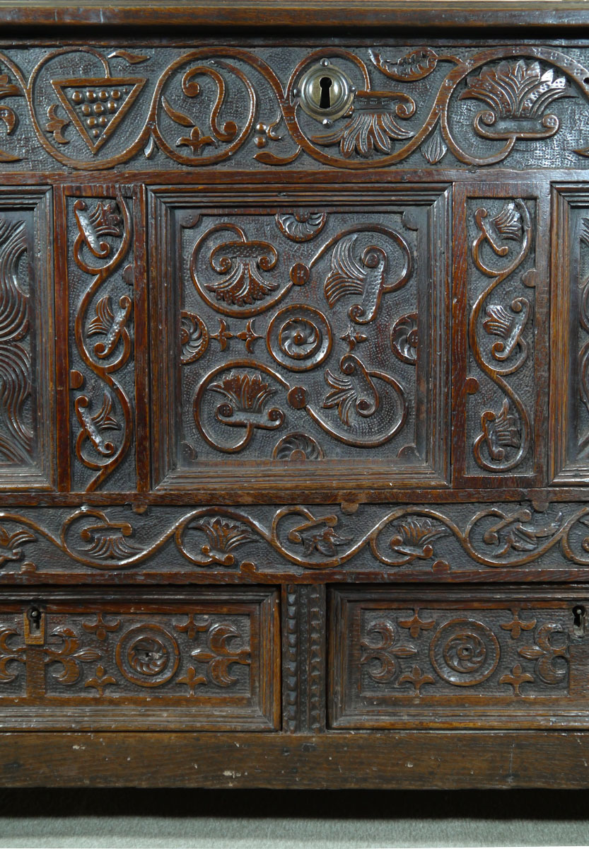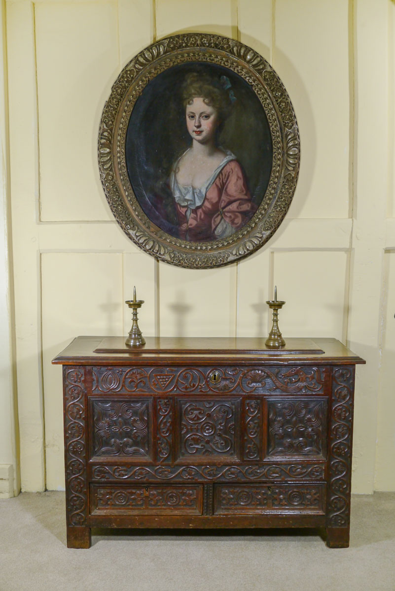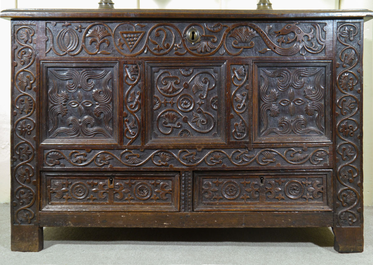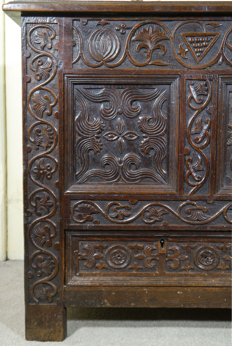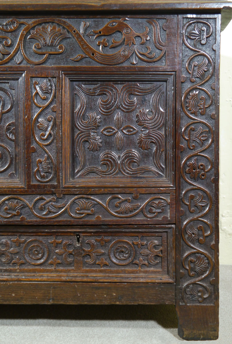 The framed lid having a raised panel, with moulded edge and fine small oak dowels, securing it to the frame (retaining the original strap hinges), above a superbly carved front.